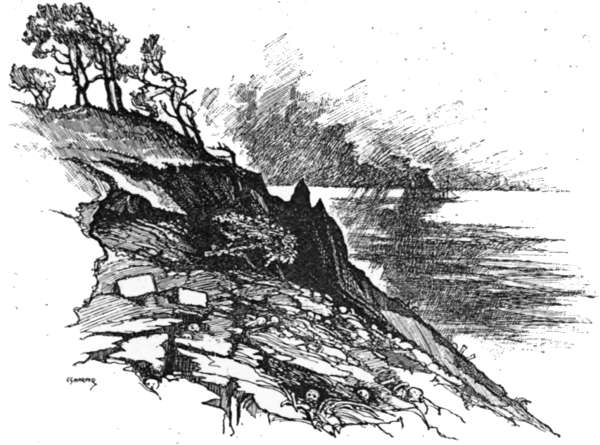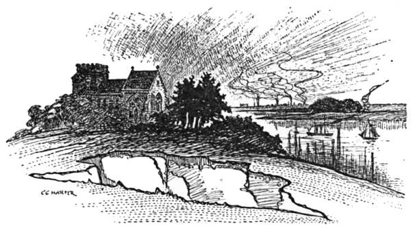Turning to the left in the village street of Eastchurch, and bearing to the right at the next turning, Warden is reached in two miles—what is left of Warden, that is to say, for the encroachments of the sea have swept away most of it. All that is left is the inelegantly named “Mud Row,” at whose end a rough bar across the rutty lane prevents one cycling over the edge of the cliffs into the sea. Here is a scene of the wildest desolation. The cliffs, about one hundred feet high, composed of dark, greasy, and crumbling clay, have slipped and fallen in every direction, and the sea at the bottom is discoloured far out with the débris. For many years past this process has been going on, and by this time some eighty acres have been swallowed up and dissolved. In 1836 the parish church was rebuilt with the stones from old London Bridge, demolished in 1832 for the building of the present structure. Delamark Banks, son of Sir Edward Banks, the contractor for the bridge, gave the stones and rebuilt the church, as a tablet removed from it, and now forming part of a garden wall at Mud Row, tells us. But it was not fated to stand long. The sea had sapped up to the church by 1870, and it was then closed. In 1877 it was pulled down, and the heaps of stones still lie by the beach a mile away. At the same time, the bodies of those who had been buried in the churchyard during the previous thirty years were disinterred and removed to Minster. But, as the cliffs continue[283] to fall, the poor remains of the more ancient dead are still exposed here, and bleach in the sun: a grisly sight. It was but a little while ago that the present writer, visiting the spot, observed children engaged in the gruesome and morbid occupation of digging out skeletons for “amusement.” And not the children of ignorant cottagers, for whom there might possibly be some excuse, but of people of perhaps some pretensions to culture and right feeling. Is it not something of a scandal that the ecclesiastical authorities should allow so dreadful a thing? Warden Point, with its village gone but its older inhabitants still thus in evidence, is a melancholy place. The sea heaves and rolls in a muddy discoloration far out, and eats away the island day by day.