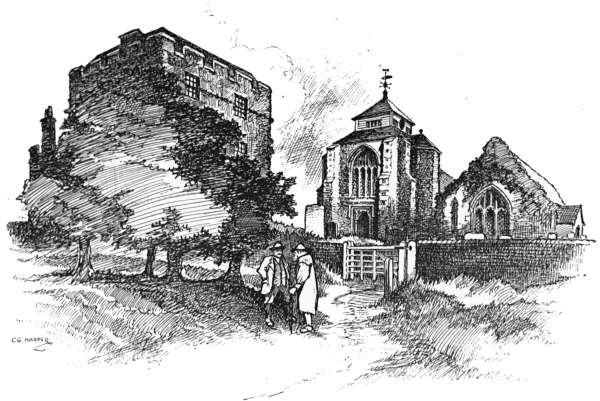 It is an idyllic and peaceful picture that unfolds itself at Newington, a roadside village, which, like many another place called “new,” is of immense antiquity, standing as it does on that old Roman military way, the Watling Street, between Dover and London, and the successor of a Roman village. Here the cherry, the pear, and apple orchards are at their best, and the hop-gardens are not wanting. Also (another relic of the Romans, who introduced them from Italy), sweet-chestnut trees abound. The ancient parish church is reached at some distance before the high road: a venerable building whose mouldering tower is built in alternate courses of stone and flints. Opposite a postal pillar-box, within a few yards of the church, notice the so-called “Devil’s Stone,” planted at the edge of the road and footpath. A very fine and large effigy of a boot-sole is seen on it. The legend runs that the Devil objected to the church being built, and, placing his back against the tower, and his foot against this stone, pushed. From the illustration, in which this stone and the church are both seen, it will be observed that the Devil must of necessity have been singularly tall to have performed this feat—or to have attempted it. But the builders had built better than they knew, and the church stood immovable. The obvious criticism that the stranger makes on seeing the stone, is that the boot-print is in[287] relief instead of pressed into it. There are things well worth seeing in the old church: brasses and screens, a copy of the eccentric will of an old-time inhabitant, and a curious altar-tomb, with a passage through one of its panels, through which, as a charm, the sick or bewitched were passed to cure them. The church is secluded amid hop-kilns and fruit farms, and backed by a wooded knoll.