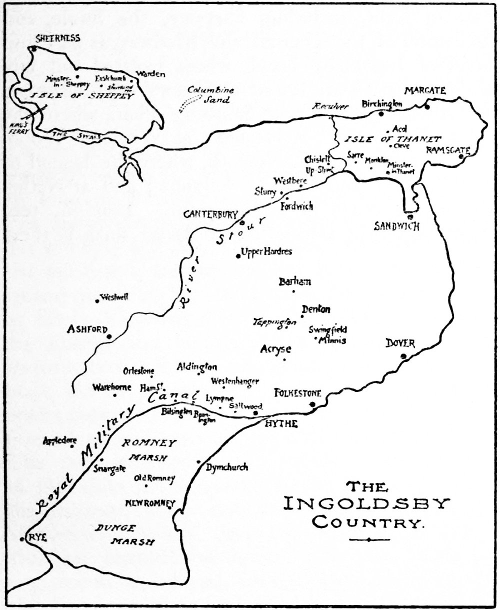 "Ingoldsby" has always been of that comparatively small number of authors who command a personal interest and affection. Reading the "Legends" you cannot choose but see that when he sat down, often at the midnight hour, to dash off the fun and frolic that came so readily to his mind, it was a part of himself that appeared upon the page. He did not and could not, when he wrote for publication under a pseudonym, be other than himself, and did not self-consciously draw a veil of style around him and speak, a cloaked figure lacking ordinary human attributes, or as other than a man of the world. He claimed no sacerdotal privileges, and we know, from the published "Life and Letters" by his son, that he was in his life and intimacies, as the Reverend R. H. Barham, the same genial wit and humorist he appeared as "Tom Ingoldsby."[Pg vi] He must, therefore, have been a likeable man, and those who knew him were fortunate persons. The next best thing to knowing him is to know something of the Ingoldsby Country, that corner of Kent where he was born and whose legends he has put to such splendid literary uses. The "Ingoldsby Legends" have so long since become a classic that it is indeed somewhat surprising that no literary pilgrim, for love of their author and interest in his career, has before this traced the landmarks of his storied district.