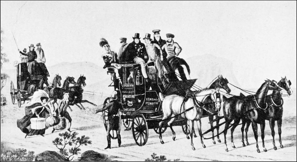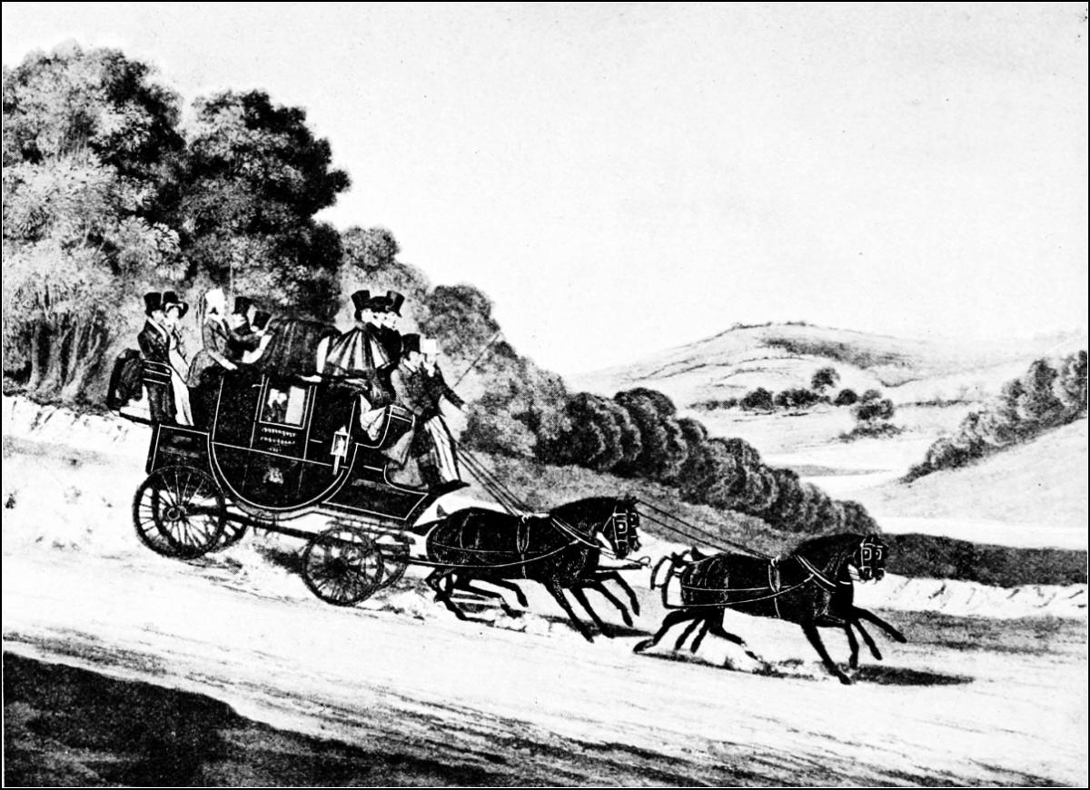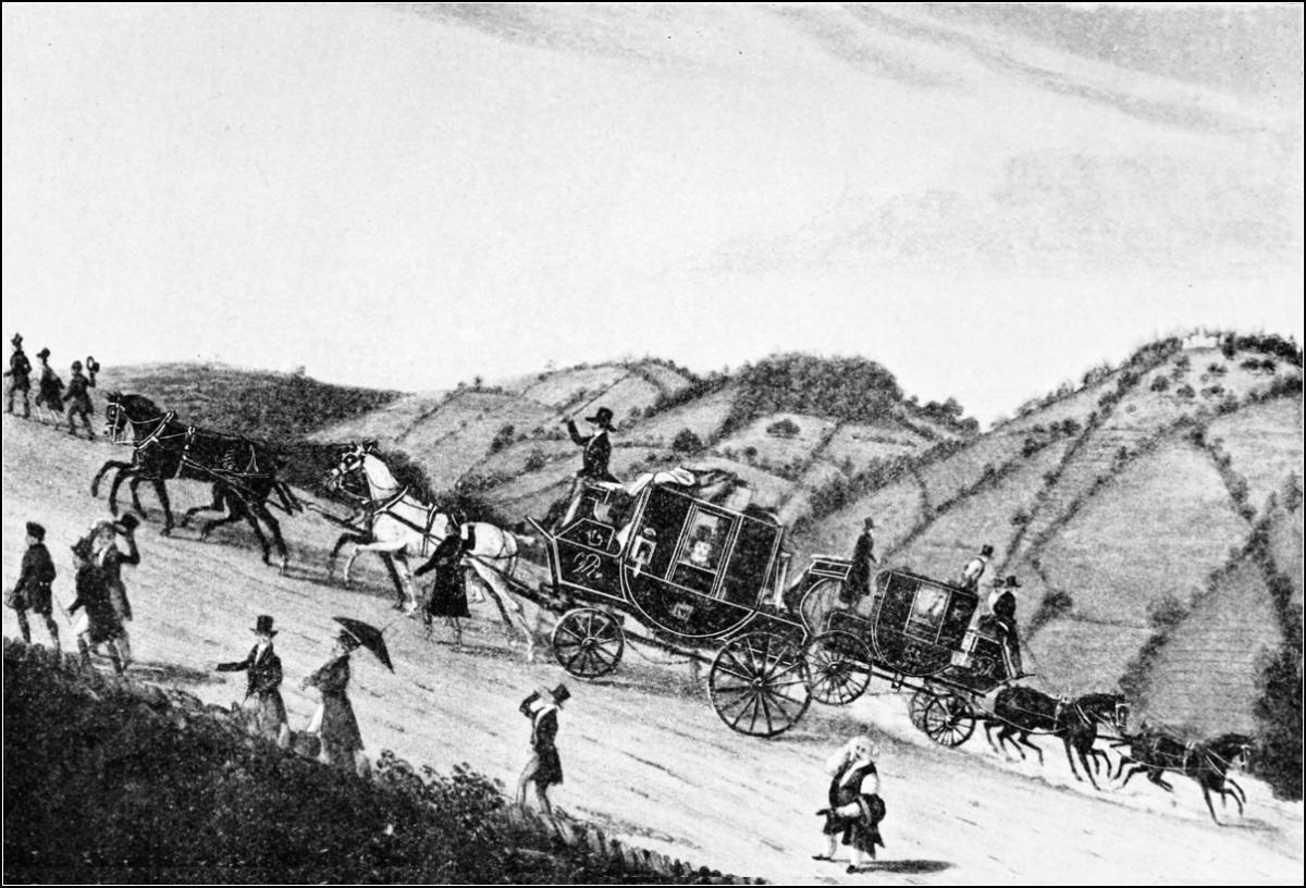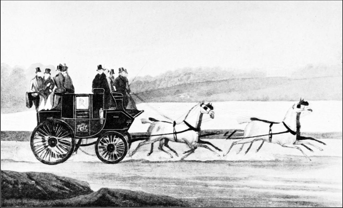 When did the immemorial co-partnership of Romance and the Road begin to be dissolved? Let us consider. The first beginnings are found in the introduction of telegraphic signalling, when signal-stations were erected on the hills, and messages were passed on from one to another by means of revolving shutters or semaphore arms. The system originated about 1795, and came into use along this road in 1803. We read in the “Observer” of that period the startling announcement: “A line of communication, by means of telegraphs, is to be established between London and the north, by which intelligence will be conveyed in six hours at the distance of 400 miles.” Here, then, we find the parting of the ways! Instead of the horsed messenger, performing that distance in, let us say, forty-five hours, the telegraphists sent messages through in a fraction of that time, providing conditions were favourable. A very serious draw-back to the system was that in dull or stormy weather it was unworkable.