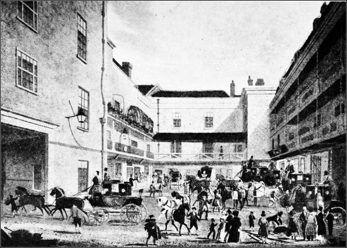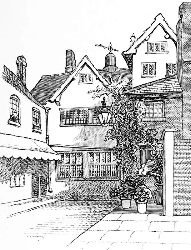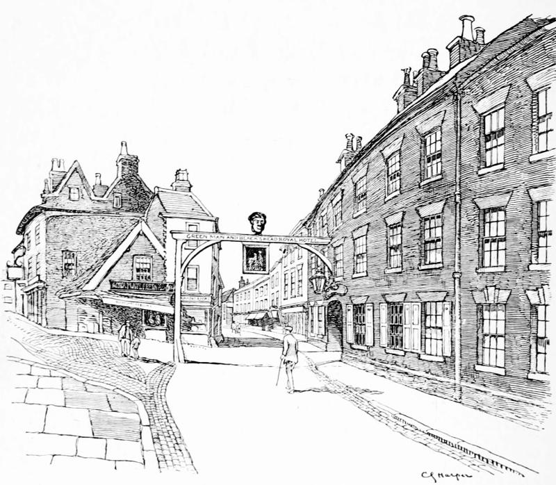 The gallows sign of the house boldly straddles the narrow street, with the “Green Man” sign pendant from it, and a huge “Black’s Head,” with glaring eyes and a gaudily painted turban, above.