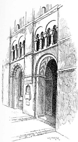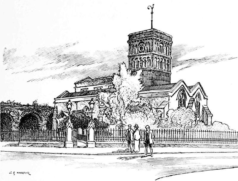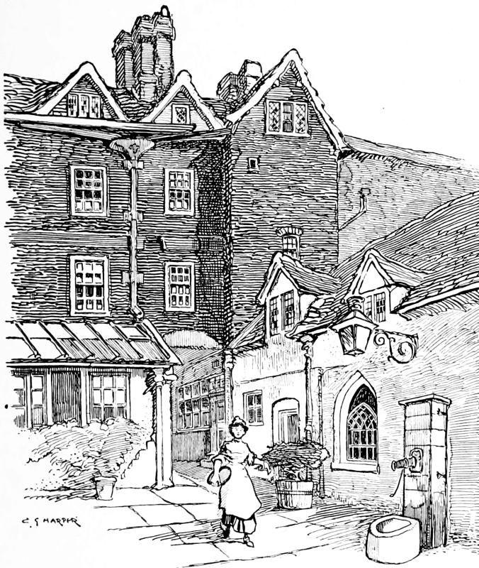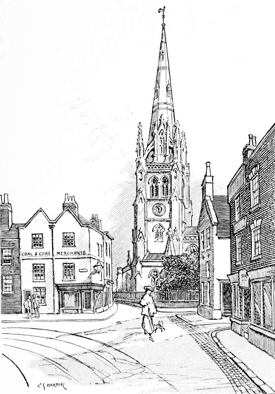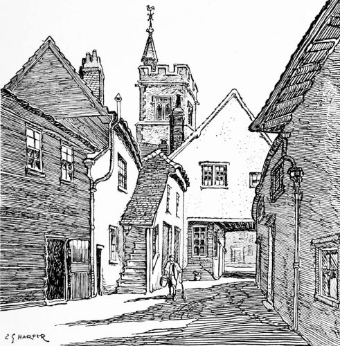 Steep streets lead up to that hub and core of the town where the church stands, and more steeply still climbs the footway up the one hundred and eight stairs of Brunswick Steps. The view, looking aloft to the church, must once have been particularly fine, but it was long since spoiled by the squalid houses built on the hillside; the very last note of the commonplace being touched in the recently rebuilt “Nag’s Head” public-house, full in the view, where not merely the photographer, but even the artist, must deal with it.