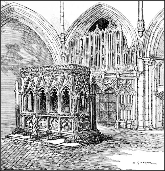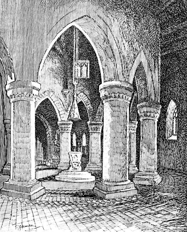 The work of bringing back the old church to something of its ancient state was costly, but the result is striking. There is a very wealth of monuments, many of the Savages, a Cheshire family of great note in their day, lying in effigy in the Savage Chapel and in the Chantry also associated with them: most notable among them all the loving figures of Sir John Savage, 1495, and his wife, Katharine Stanley. These lie side340 by side; the knight’s right hand clasping her left. It would have been better had the alabaster figures not been blackleaded by some old-time caretaker!