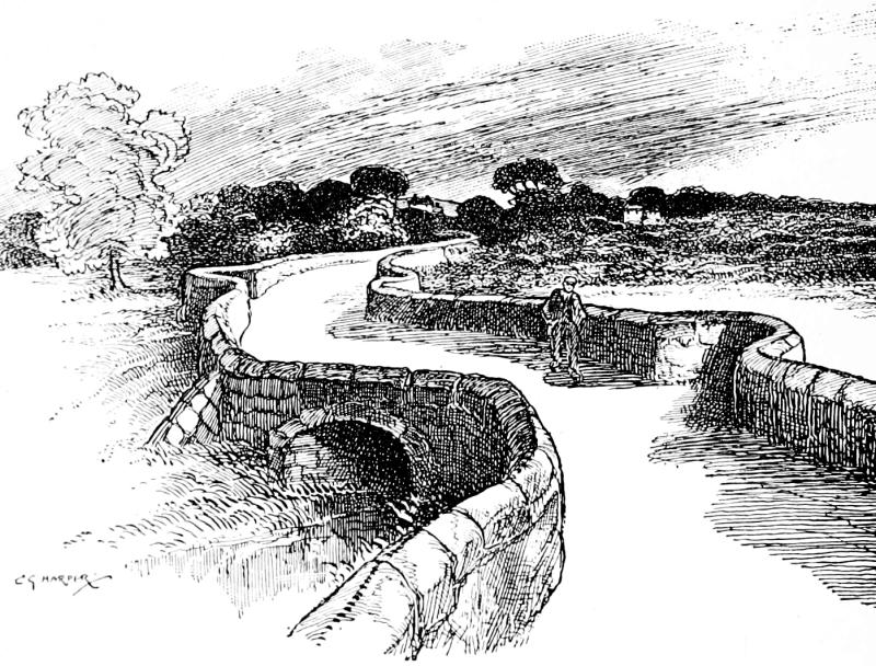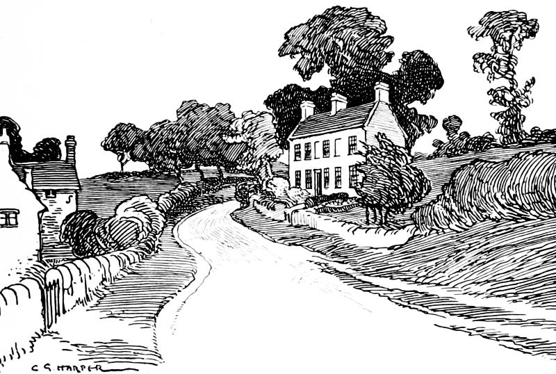 What the mechanical telegraph began the railways and the electric telegraph completed, and the roads—save for the cycles and the motor-cars from whose presence Romance flies abashed—havex lost their intimate touch with life. They are largely removed from the sordid instant, and that is why we love them. Present-day romance will only be found by the next generation when, to adopt an American locution, it has become a “back number”: for ourselves, we are fain to the poor recourse of listening to the elfin harmonies of the winds in the wayside telegraph-poles, and to deduce romantic messages from those sounds; but alas! so little romantic may they be that the wires are probably flashing market reports to the effect that “grey shirtings are quiet,” or “bacon was steady.” Yet, on the other hand, a police message may be passing, to lead to the arrest of some fugitive: some fraudulent Napoleon of finance or one of the smaller fry: you never know!