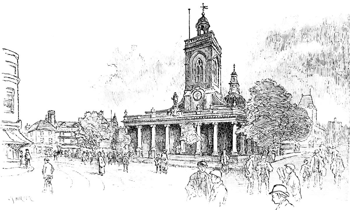 The suburban road is here sufficiently broad, and approaching Stockport, where the fine modern church of St. George looks along the vista with its great bulk and graceful spire, it is even imposing, but the prevalent grey atmosphere dims and flattens everything; obscuring details, like an impressionist painter. The great church of St. George, in the newly formed parish of that name, was built in 1897, at the enormous cost of £90,000; borne entirely by one person. With354 a rather touching, but misplaced, confidence it is surrounded by trim lawns, and an almost rural-looking vicarage rises close by; but the stone-work of the church shows signs of turning black, the earth is growing dank and stale, and the lawns are by degrees going bald.