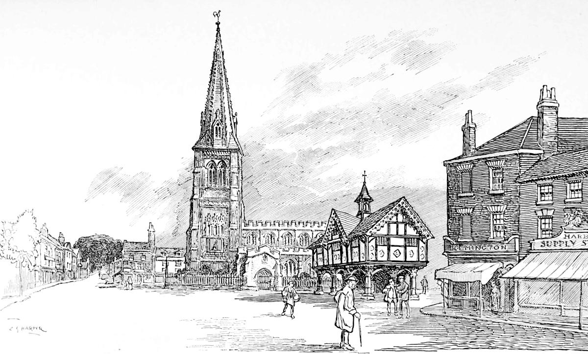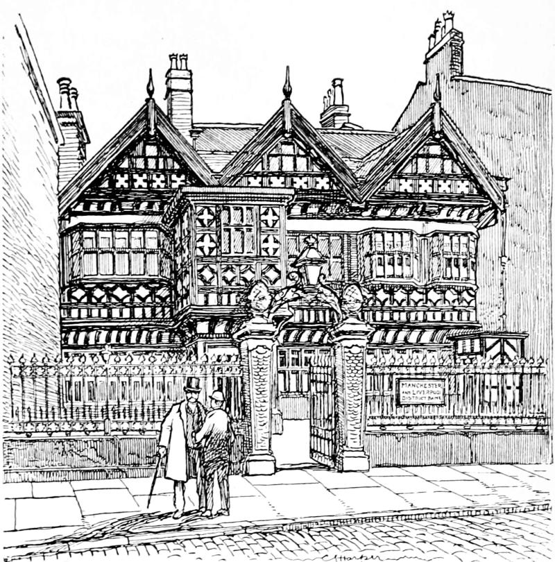A relic of an older Stockport that knew nothing of cotton-mills or other factories is to be found in the street called Great Underbank. This is the old timbered town house of the Ardernes of Harden and Tarporley. This ancient family resorted hither in the long ago from their various country seats, and called it “coming to town.” The Manchester and Liverpool District Bank now occupies the fine old place.
