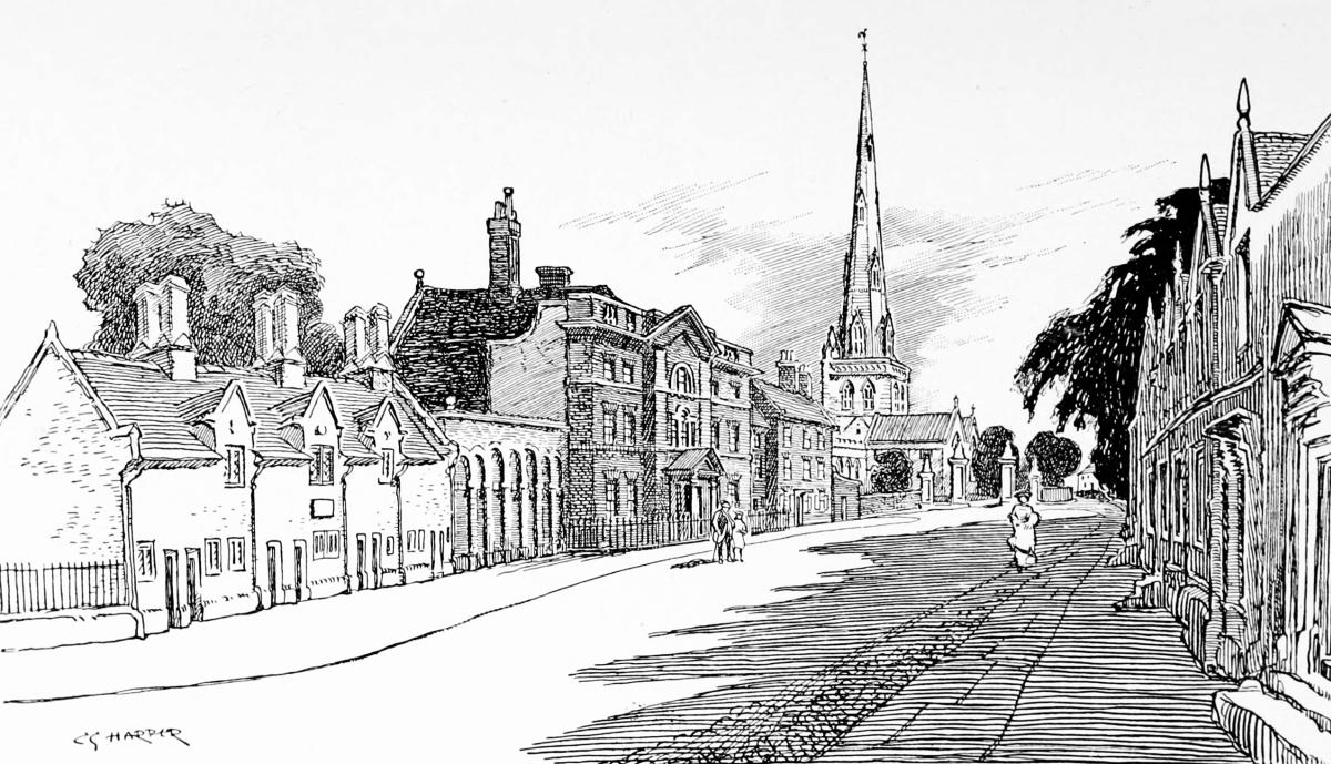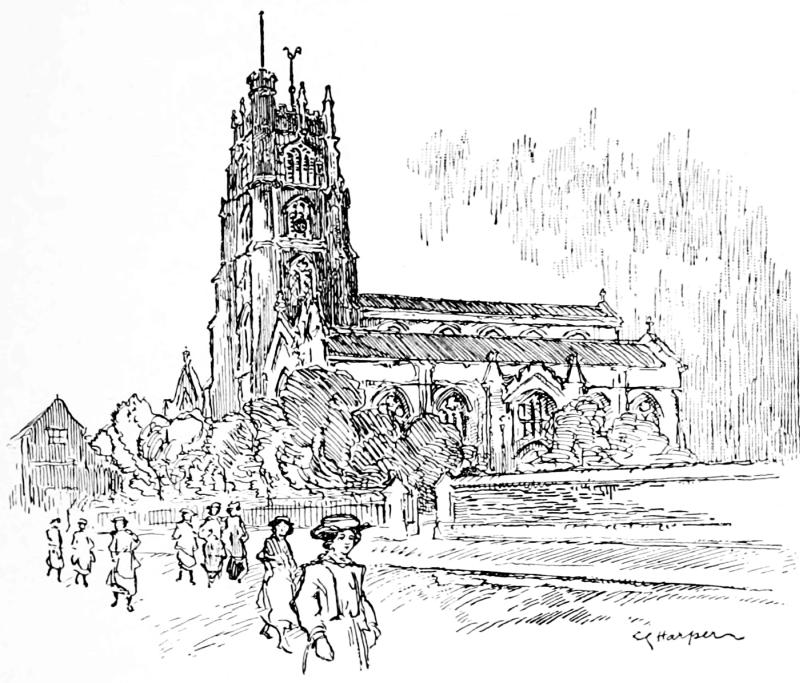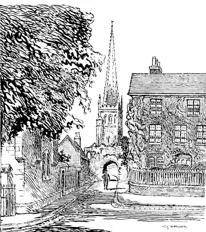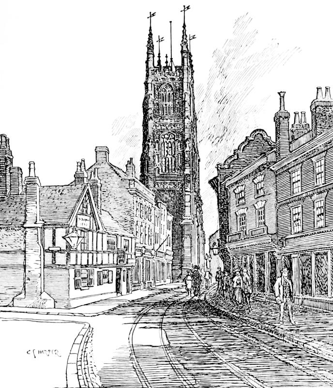 St. Michael’s Church, a grand building beautifully restored, has had varied fortunes. It was damaged when the Parliamentary army besieged and took the town, and was later very largely rebuilt on a semi-pagan “classic” model. The339 great ornamental iron gates enclosing the stone-flagged churchyard are relics of this period, and incidentally disclose the ironworkers’ ideas of what angels are like: a gilded figure over the principal gate representing a very saucy-looking young woman ecstatically pirouetting on one foot, a kind of celestial can-can, and flourishing a big trumpet.