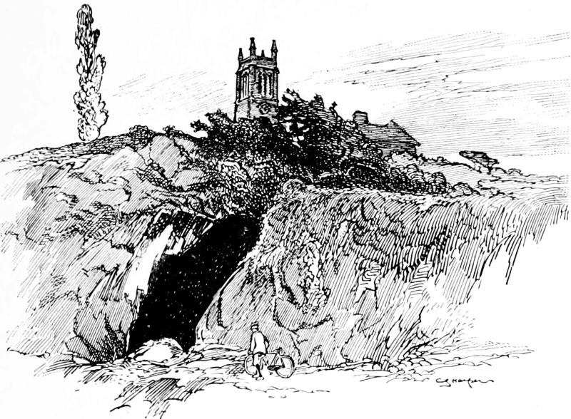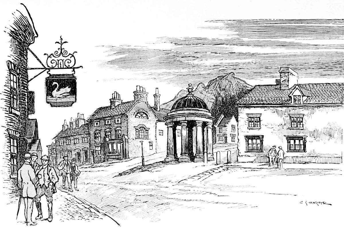 Here, across Hanging Bridge, the road has left Derbyshire and entered Staffordshire. It goes up a long, long, staggering hill out of the valley of the Dove and comes to some very grim uplands, where the fields have stone walls instead of hedges, and moors presently take the place of fields. The situation is extremely exposed; hence perhaps the name of the neighbouring village of Blore, i.e. a blowy, windy place. Swinscoe, or Swinecote, as it is more properly styled, i.e. “Swine’s house,” is a lonely hamlet with a background of dense plantations crowning two forbidding hills. Calton Moor succeeds to it, with a farmhouse at the cross-roads, once the Calton Moor Inn, and the scenery now grows wildly beautiful; the road at330 last descending with alarming steepness to Waterhouses, with a dangerous level crossing of quarry, or other, works at the bottom. Here the river Hamps sings along the valley, on its way to join the river Manifold, disappearing underground, among the limestone rocks, for some miles: the neighbouring village of Waterfall taking its name from this phenomenon. Waterhouses was in the coaching days nothing more than its name implies: a few scattered houses, chiefly inns, where the coaches changed horses, built in modern times beside the river Hamps, bordering the road. Nowadays it has grown considerably, and since the recent opening of the Leek and Manifold Valley Railway, with a Waterhouses station, it has grown very popular with trippers to the wonderful scenery of the neighbourhood. There are limestone331 rocks, picturesque cliffs, and ancient bridges along the valley of the Manifold, and a cavern dedicated by the superstitious Saxons to their deity, Thor.