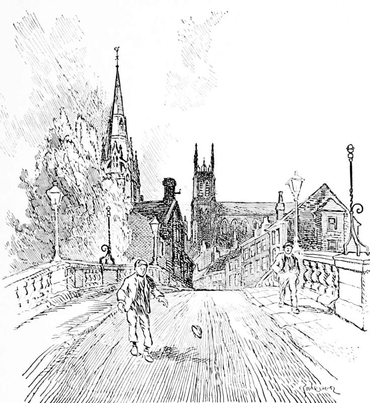 Stockport, in its local patriotism, would probably resent being lumped with “Manchester,” and Manchester itself might object, but to the passer-by, ignorant of local divisions, it is all one with the great city, although the town is not even in the same county with it; the river Mersey here dividing Stockport in Cheshire, from Manchester in Lancashire. Cheshire, in its most characteristic condition, is the Cheshire of the cheese-farms in the great fertile plain, where mild-eyed cows stand knee-deep in pastures; and a great manufacturing town is entirely out of sympathy with such idyllic scenes. I give you my word there are no idylls in Stockport: only a road where the granite setts are greasy; the pavements thronged with busy people and the girls of the cotton-mills; the sky smoky, and the air filled with distracting noise. But to see a less crowded and less noisy Stockport would be a sorry thing, for it is the wealth-producing commerce of the place that makes it what it is, and the times when the railway-lorries cease to crash and rumble along the streets, and when the waggons, laden with mountainous heights of grey shirtings, are no longer seen on their way from the cotton-mills to Manchester warehouses, will be troublous times355 for not only mill-hand and manufacturer, but for every one.