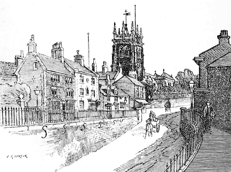 The old original Macclesfield stands high above the sites of these many factories, and centres about the ancient parish church of St. Michael, upon its rock, the successor of a very early church of the same dedication, which indeed furnished Macclesfield with its original name of “Michael’s Field,” whence, by way of “Maxfield” we obtain the present style. The dedication seems, however, to have been changed at some period unknown, to All Hallows, and was so in the sixteenth century: reverting later to the present style.