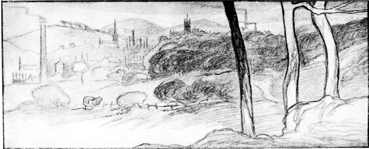 The tall railway viaduct that spans the Mersey and goes high over the steep and grimy streets leading down to it, is impressive in its very bulk and in the smoky atmosphere that reveals it only in a broad flat effect; and, in the same way, the towering buildings that have no beauty of detail, gloom down upon you with an ogreish aspect that transcends their ugliness and elevates it into the region of horrific romance.