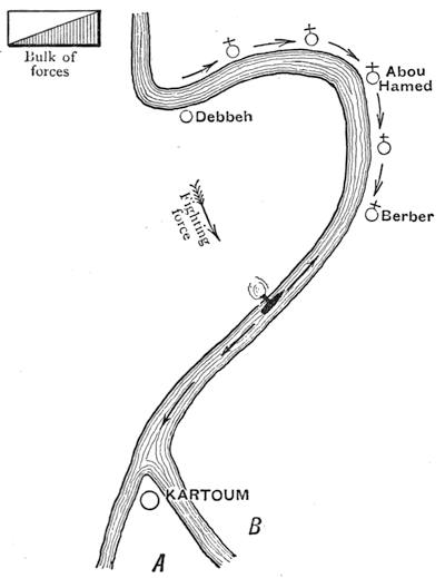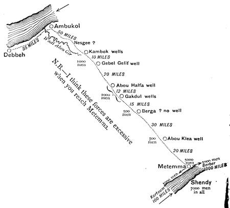 [320] The troops both marched and fought, formed up in square, with camels and baggage in the centre, and a few mounted Bashi Bazouks and men on dromedaries in front to feel the way. In this formation the army could hardly accomplish eight miles a day, six being the usual march, and it could, consequently, only strike a blow when and where the enemy pleased.