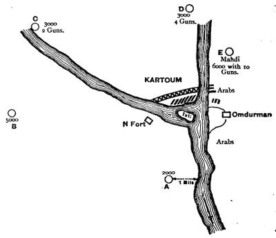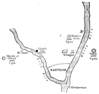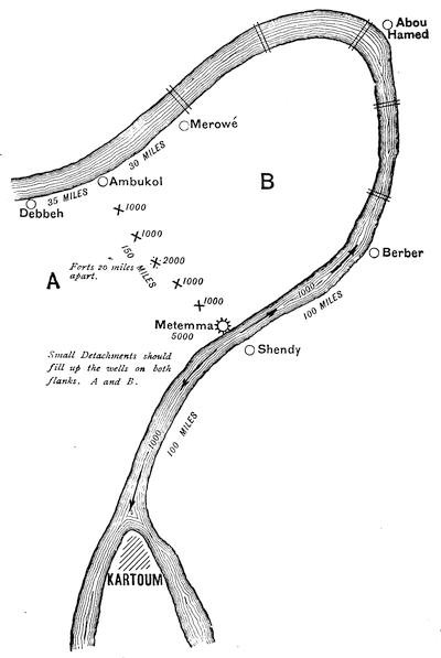 [318] Two of the battalions were those of the 2nd Regiment, which had been ordered by Abdel Kader Pasha to operate against the rebels at Abu-Djuma, but they had done absolutely nothing. It is not known to what regiments the other battalions belonged, and whether they had all been sent up from Kartoum, or if part of the 1st Regiment had been withdrawn from Sennaar. Owing to the hostility of the Hassanieh Arabs it had been necessary to reinforce the garrison of Duem by a battalion, and 2000 troops remained in reserve at the camp of Omdurman.