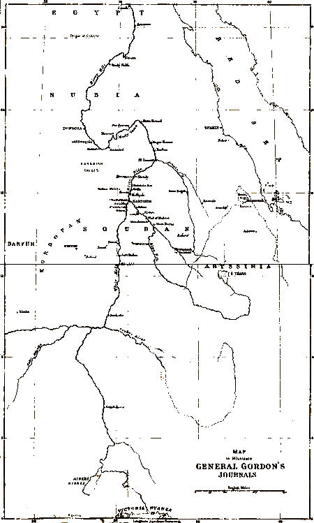 Gordon’s resignation soon led to his reinstatement on terms more fitted to his views. In the new position he felt strongly that, great as was the trust and the almost superhuman work expected of him, if he did not entirely succeed at least he would not be hampered. He was not only appointed Governor-General of the Soudan in Ismail Pasha Yacoub’s stead; he was given authority such as none had previously enjoyed—complete power, civil and military, with the life or death of his subjects in his hand; and no man dare enter his dominions without[xvii] special leave. He had stipulated that this supreme command should be independent of Cairo, for he knew the Egyptian authorities to be in favour of the slave-trade. The undefined territory now his had hitherto been subject to several governments—Arab, Egyptian, Turkish. Henceforth Soudan was to mean the vast territory limited on the north by Upper Egypt, on the south by the Lakes, on the east by Abyssinia and the Red Sea, and on the west extending beyond Kordofan and the newly acquired sultanate of Darfour—the whole roughly estimated at more than 1600 miles in length, and 700 miles in width. There were to be three Vakeels or Sub-Governors: one for the original Soudan, another for Darfour, and a third for the Red Sea, or Eastern Soudan.