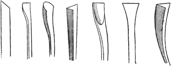 Bent Tools. Both chisels and gouges are made straight, or bent or curved in the shank. It often happens that in deep cutting, or in hollowed spaces, it is impossible to cut with an implement having a straight shaft, while with one differently shaped the wood can be easily removed, Fig. 6.
