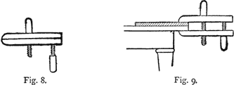 II. Holdfasts.—Clamps or Cramps, Fig. 7. These cramps[6] are small iron frames, like three sides of a square, with a screw in the under limb. They are used on the edge of the table to hold the work firmly down to its surface; two or more are always employed. Their fault is that they indent and damage the work; a piece of waste wood may be interposed between the work and the upper limb to prevent this, but such a guard is generally in the way and otherwise objectionable. Hand Screws, Figs. 8 and 9, are a far better tool, entirely free from the above-named objection. They consist of two strips of hard wood rounded at the one end, or jaws, and two screws, also of wood, one of which passes through both jaws, and the other through only one; the end of this second screw entering a recess made in the other jaw to retain it in position. To use them the handles are grasped firmly in the two hands, and the hands are revolved around one another away from you, which causes the jaws to open exactly parallel with one another. When the opening between the jaws equals the thickness of the work and the table, the hand screws are slipped over them, and the second[7] screw then alone receives an extra half turn, this throws the jaws slightly out of parallelism, and effects a powerful grip upon the work at their points. They are exceedingly powerful also in holding work for gluing together and other purposes, and are made of all sizes.