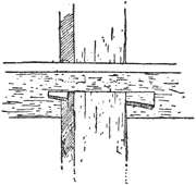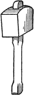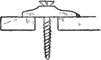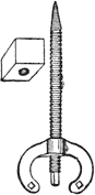 III. Carvers’ Screws, Fig. 10. These are iron screws about 12 or 14 in. long, with a finer pointed screw, like that of a gimlet, at the one end, and a square at the other; on the screw is a winged or fly nut. To use them the point is screwed firmly into the under side of the work, with the fly nut removed and used as a lever by one of the holes in its wings placed on the square on the end of the shaft. The shaft is then passed through a hole made through the top of the bench or table, and the fly nut replaced on the screw below the table to fix the work down to it. The screws are long, which is sometimes convenient, but if the work be thin it is usual to put a block of waste wood on the shaft before the fly nut, to avoid the tedium of having to screw the latter up a long way. Slackening the nut enables the work to be turned round to any required position, and there is nothing above the table except the work.