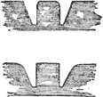 Gouges, Figs. 2-5, are chisels more or less rounded. These, of all widths, vary from the extra flat, which is so slightly curved that it might at a casual glance be taken for an ordinary chisel,[5] to the ordinary “flat.” A little more bend or convexity gives the scroll gouge. A semi-circle or any narrower portion of the same curve is a hollow gouge, the smaller sizes of which are called veiners, the very smallest of the latter being known as eye-tools. There are some differences of names for these among writers, as well as workmen, but for all practical purposes the terms here used may be accepted, and are understood by all who sell the tools.