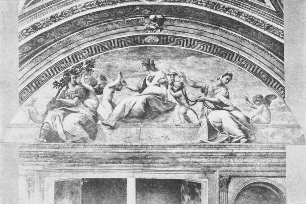 They learned from his writings to think not only of things, but of ideas. Even to consider ideas of more importance than things; especially the idea of beauty. You will remember that in speaking of Raphael’s Allegory of Jurisprudence, we said that Jurisprudence represented an abstract idea: the conception of what justice is in itself and of the qualities of Prudence, Firmness, and Temperance that it involves, apart from the machinery for making and administering the law. Men make laws, and{236} some are good and some are bad. Even the good ones are not always perfectly administered. To-day, in America, our conception or idea of law is higher than our methods of putting it in practice. Everywhere, always, men’s ideals are higher than their conduct.