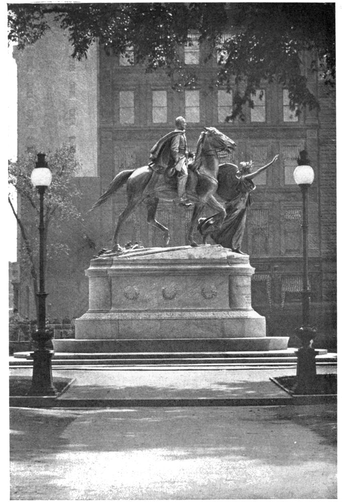 A similar attempt to reënforce the ideal sugges{13}tion contained in the realistic parts of the group with the direct introduction of a symbolic figure reappears in the equestrian statue of General Sherman. But the figure in this case is more intrinsically a part of the general design in perfect harmony of character and feeling, and the group as it stands, while almost the latest, is probably the most completely grand example of Saint-Gaudens’s art. Sherman leans a little forward in the saddle with a handling of the reins that keeps in control the impetuosity of his big-boned, powerful charger, an action of the hands very characteristic of an accomplished horseman. His head is bare and his military cloak floats from his back in ample folds. Victory moves ahead of his left stirrup, palm branch in hand, her drapery buoyed up with air; the horse’s tail streams behind; throughout the whole composition is a single impulse of irresistible advance. From every point of view the mass is compact with dignity, ornamental in line and bulk, alive with elevated and inspiring energy. At closer range one may discover the big simplicity and pregnant generalisation of the modelling, also the meaningfulness of the characterisation. The horse in build and gait is a serviceable beast, bred for courage and endurance; the rider, a man of iron purpose, indomitable in face and carriage; while{14} the woman’s figure in the grand spirit of the flowing lines and in the lofty sadness of her mien touches a chord of triumph and pathos, of the glory and the tragedy of victory.