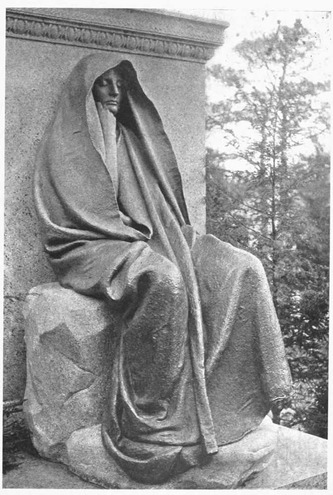 Let us trace the gift of idealising as it appears in several of his works, selected because they represent a descending scale from the purely ideal to the idealised fact. And first the statue of “Grief” in the Rock Creek Cemetery. I made the pilgrimage from Washington one sunny autumn afternoon with a companion. The gatekeeper directing us, we threaded our way along the labyrinth of paths, among the chaos of conflicting monuments, so many of which testify{10} to impotence of taste. Finally a glance behind a hedge of cypress—we are indeed on holy ground! Within the little enclosure of solemn greenery a bench, marble and of Greek design, invites to sit; the world is all outside, and here before us, raised upon a slight pedestal, enough to lift it above the level, but not too high for close and intimate communion, is the Presence: a woman’s seated figure, wrapped about in coarse drapery that shrouds her head and falls in long, loose, heavy folds at her feet. We have heard the story: That a husband, robbed of his wife with shocking suddenness, called upon the sculptor to express in plastic shape the void in his life, enjoining him to ignore all symbols of hope and to give utterance only to the consuming hopelessness of loss. And here before us—in the isolation of the figure, in the uncompromising sternness of the drapery, in the majestic agony of the face, the eyelids lowered in pain, the lips full and set in the effort of endurance and also in a protest as proud as it is despairing—there is expressed a universality of grief that sums up the sorrow of the modern world, as well as the eternal question of the why and to what end. Under the spell of it a wife and husband sit on into the golden afternoon, chastened, purified, elevated, drawn closer to each other by the realisation of the mystery of grief, and with a{11} renewed sense of the sanctity of happiness ere the shadow falls. Here indeed is an idealisation, complete and absolute; no helping out with wings and symbols, but the rendering of a simple, natural fact—a woman in grief; yet with such deep and embracing comprehension that the individual is magnified into a type. The emotional appeal is universal.