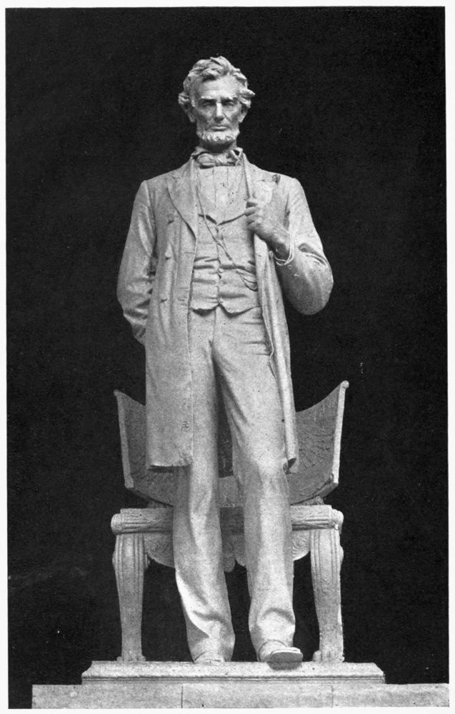But how does Saint-Gaudens fare when he confines himself to a factual representation of his subject? Let his statue of Lincoln at Chicago testify. No grace of line or grandeur of mass; only a chair behind the standing figure to eke out the stringiness of the legs and in a measure to build up the composition. Nor could the sculptor snatch an easy triumph through any heroic rendering of the figure, spare and elongated, in clothes uncompromisingly ordinary. But the man as he was, and just because he chanced to be the man he was, was great, and in the fearless acceptance of this fact the sculptor has seized{15} his opportunity. The statue is planted firmly on the right foot—not every statue really stands upon its feet—the right arm held behind the back—these are the characteristic gestures of stability, tenacity and reflection; while the advance of the left leg and the grip of the left hand upon the lapel of the coat bespeak the man of action. With such completeness are these complex qualities suggested and then crowned with the solemn dignity of the declined head, so aloof in impenetrable meditation, that the homely figure has a grandeur and a power of appeal which are irresistible. True, our imagination, reënforced by knowledge, goes out to reach the artist half-way, thereby lessening the space he has to travel in his idealisation of facts. Behind this isolated figure looms up the scene in which he played so great a part. It was precisely because this scene was present to the sculptor’s imagination, and he knew it would be to ours, that he set himself to the most realistic rendering of his subject and thereby triumphed.