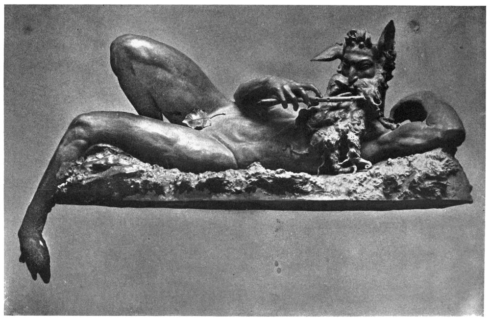 Then may we not see in “Pan” an embodiment of his experiences of passionate youth? Truly it is also the reincarnation of the spirit of the old golden legend of the world, before it was burdened with seriousness, still irresponsible and sportive; when the woods and streams were haunted by creatures close akin to the animals, but gifted also with something of man’s higher opportunities: lazy, sensuous and luxuriously content. But this is only to refer back to a mythological type the perennial characteristics of the birth of passion in a youth. It seems to me quite one with the philosophic bent of Barnard’s mind that he should have comprehended both intentions in his “Pan.” It is as if he had analysed himself and then exorcised his vagrant desires by imprisoning them in bronze. As an artist he takes his opportunity in the recumbent figure of enforcing the sensuous charm of the long, sinuous limbs, and once more indulges in the luxuriousness of firm, soft fleshiness; this time, however, with muscles not relaxed in sleep but unstrung in the sweet lassitude of lazy ease. Then what a subtle insinuation of contempt for the type as he conceives it! He sets one long asinine ear acock, and lets the other droop ridiculously, while in the slanting eye there is a leer of mischievous, foolish wantonness. I{31} do not forget that this is later work, executed after Barnard’s return to America; yet his point of view is so subjective that he can scarcely fail sooner or later to express the struggles of his own soul.