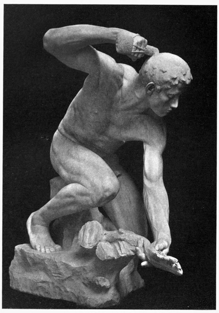The other statue, “The Hewer,” was begun with the deliberate purpose of embodying in a series of figures the gradual evolution of mankind and, I fancy also, of the human soul toward higher possibilities. There is nothing unusual in the theme, but much in the way in which Barnard has comprehended and expressed it. He has felt it in its elemental significance and set it forth with monumental simplicity. The background of his imagination, and he makes it part of ours, is the nebulous immensity out of which primitive man emerges toward the light. The step is won by putting forth of strength; but tentatively, gropingly, with only partial consciousness of strength; there is an exertion of power, but a