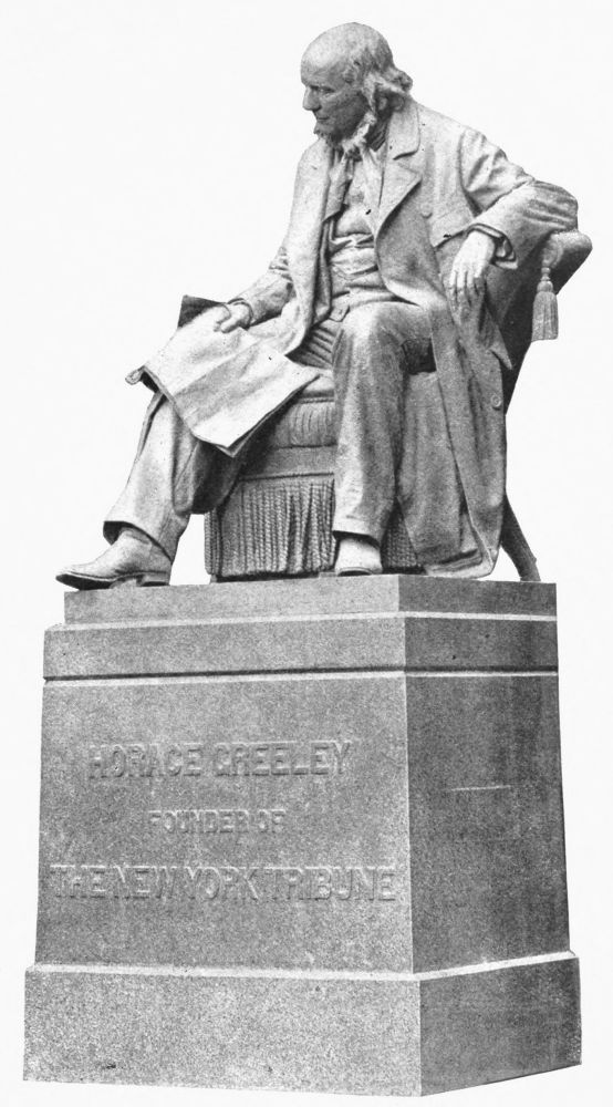 No less turmoil surrounds the Greeley monument in Newspaper Row and, outwardly at any rate, of a less savoury character. Moreover, its pedestal abuts upon a narrow sidewalk, and the figure, seated in an armchair, has the unhelpful background of a large plate-glass window. It is itself, too, of shambling build, uncouthly costumed, the large, round face, oddly fringed with a rim of whiskers. The legs are wide apart; one arm rests on the back of the chair, the other lies upon the thigh, its hand holding a sheet of paper; the round shoulders droop forward, and the head is inclined so as to bring into view the flat, dome-{49}like skull. Yes, the whole composition is the very reverse of what we usually understand by statuesque, and thousands pass and repass it daily without any recognition, so occupied are they in threading their way through the swarm of loud-lunged sellers of chronic “specials.” Yet if you will step back into the roadway, at the risk of being demolished by trolley-cars or wagons full of mile-long rolls of paper, you cannot fail to be impressed by the very strangeness of the figure. How full of character it is! Sitting back almost in a heap, pondering some point, the figure yet suggests that it is about to rise and put its resolve into action, so remarkable is the mixture of downrightedness and alacrity. It is indeed a representation of character truly original and of a convincing force, that bears the stamp of genius. Let us place it in our respect alongside of Saint-Gaudens’s “Peter Cooper,” as equally a triumph of art over uncompromising material, and, indeed, along similar lines of unflinching acceptance of the actual facts of the problem, and of broad, ample sympathy with nobility, though it does not lie upon the surface.