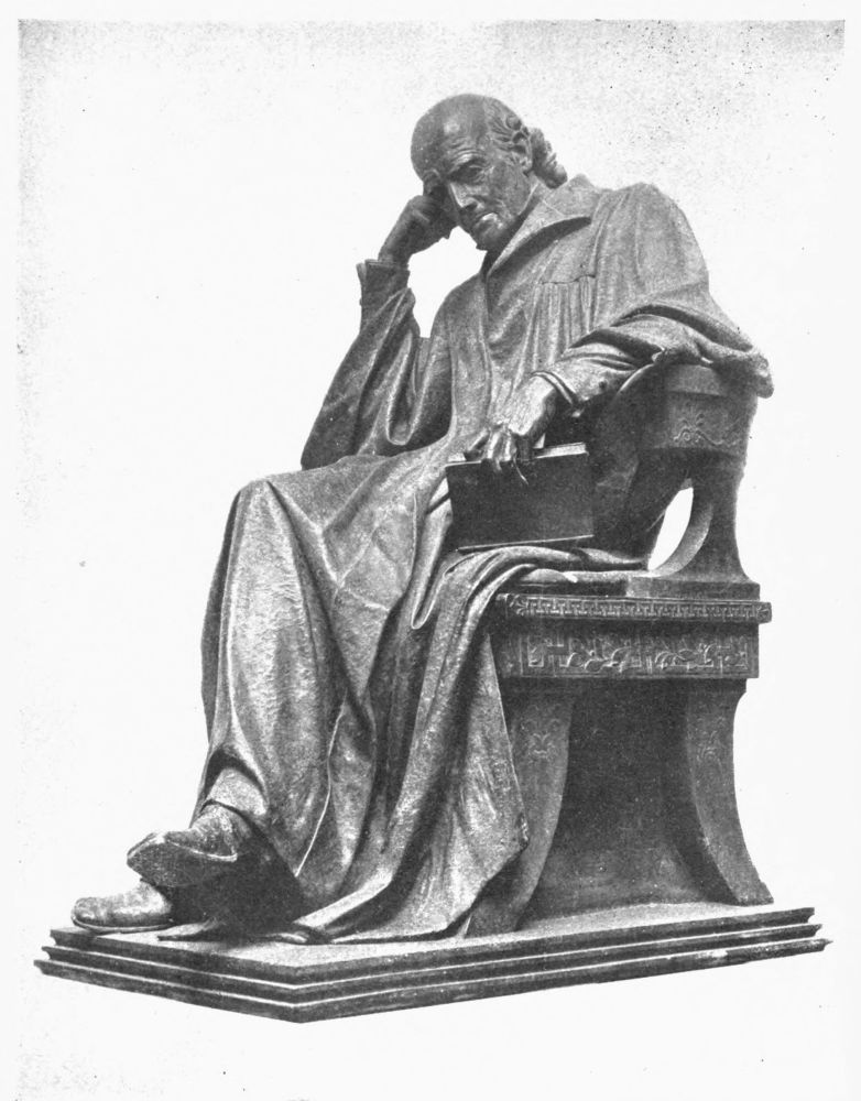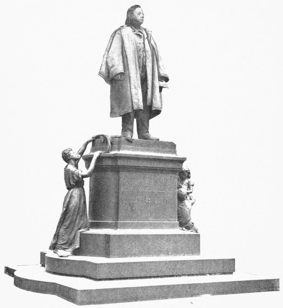 For the convenience of analysing Ward’s methods I have ventured to regard these three statues as examples of the significance, respectively, of clothes, form and character. Not{50} quite accurately, I admit, because the three motives unite in all in various proportions; but perhaps I am right in feeling a preponderance of the one in each. However that may be, we shall find a completely balanced union of all three in the Beecher monument. The sculptor had particularly in mind the episode of Henry Ward Beecher’s visit to England in 1863, on a special mission from President Lincoln, for the purpose of bringing to English public notice the true position of the North. He was met by noisy opposition, but bore it down by indomitable endurance and intellectual force. In the strongly marked, mobile features; in the intellectuality of the head, carried so resolutely above the broad chest; in the striking simplicity of the quiet, stalwart pose, no less than in the absence of all rhetorical gesture in the arms, which are suspended at the sides; even to such a detail as the right hand, not clenched aggressively or held in indecision, but with the fingers drawn up to the thumb, a gesture that mingles alertness with poise, the figure expresses character, rocklike will and mental preëminence. The Inverness cape serves to give increased weight and breadth to the form; one arm being restrained within its folds, the other free for a fling of action if the occasion require it. The figure bears down{51} upon its pedestal, column-like, monumental in the highest degree. It is a portrait-statue of most extraordinary impressiveness.