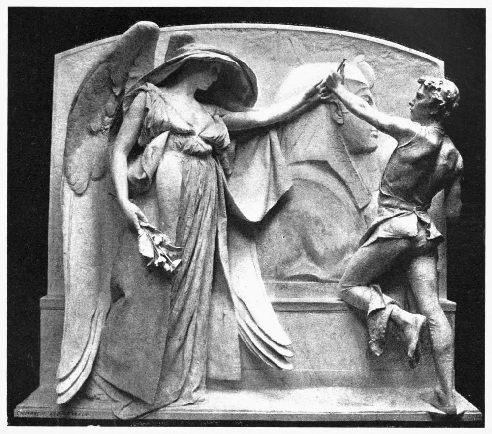 In its naturalistic tendency and expression of profound emotion the “Monument to the Dead,” by Bartholomé, is at one with Saint-Gaudens’s work; but I found myself comparing it with the latter’s figure of “Grief” in the Rock Creek Cemetery, near Washington. Then its degree of naturalism is found to be less. It shows some influence of the classic tradition in the use of nude figures and in their elaborate disposition along{8} the background of masonry; while the single figure by Saint-Gaudens is draped and presented with an unaffectedness of arrangement and with an intimacy of appeal that is at the same time more naturalistic and more poignant.