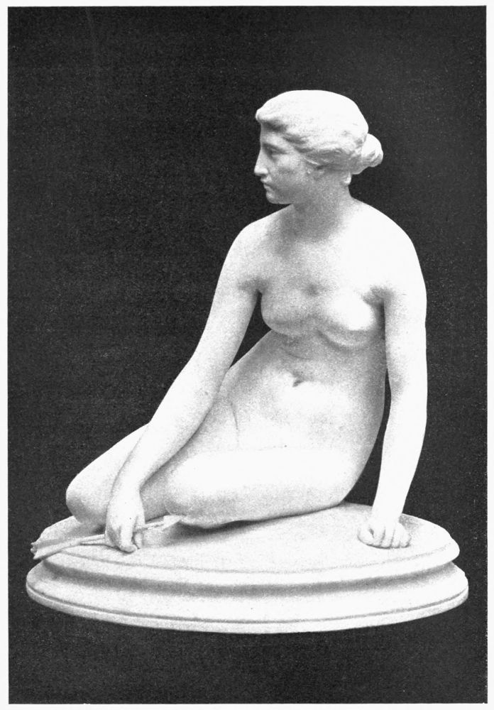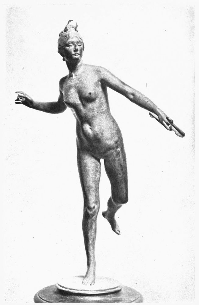 In further proof of this let me refer to two more of his statues, one of which had its origin in chance, the other in deliberation: The former is “Maidenhood” which was primarily suggested by the pose of a model, spontaneously assumed. It had character and was evidently characteristic of this individual type of girlhood. He studied the figure, first in its ensemble and then in the{34} correlation of its parts, and as he worked the floodgates of sentiment were gradually lifted, until there poured into the work his pent-up feeling and convictions concerning female beauty, his personal ones as a man and the abstract devotion that he felt for it as an artist. The result is a statue, lovely as a piece of technique, lovely also in its inspired interpretation of beauty of form and soul; a figure that has the allurement of individual personality, as well as that higher quality of abstract loveliness which belongs to an ideal conception, rendered with exquisite reverence and a spirit of purest poetry.
