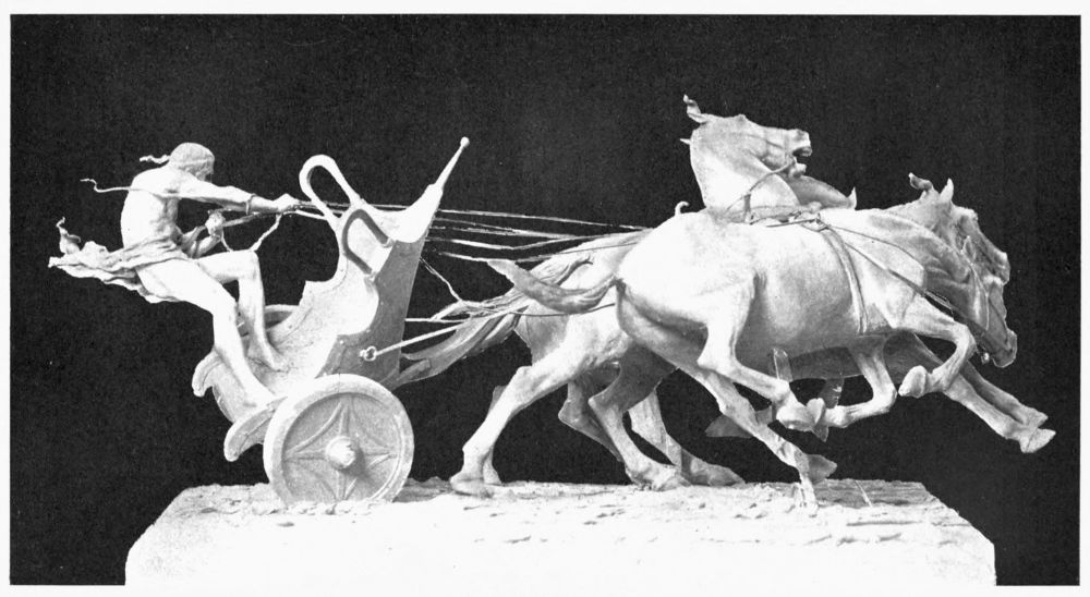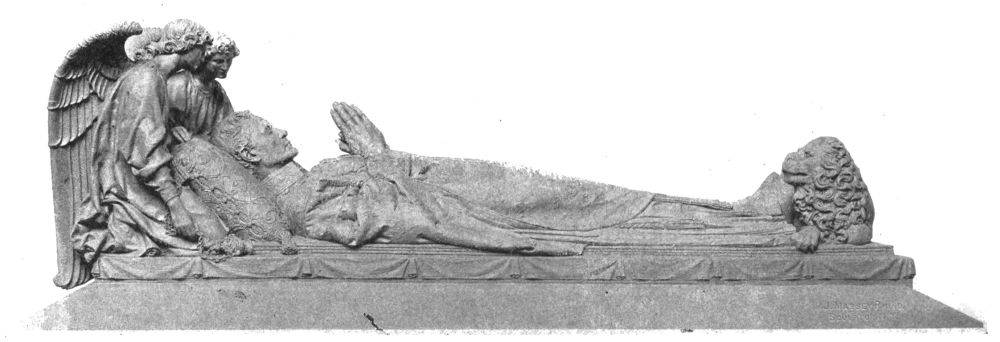 The pedestal of the “Beecher” is embellished with figures. On one side a woman and on the other a little girl is depositing a wreath, and a boy is steadying the latter figure. They are well modelled in natural and graceful movement,{52} but they impart a touch of sentimentality, so alien to Ward’s habit and, indeed, to the spirit of the statue, that I wonder whether they were not a concession to the wish of the subscribers. Figures again adorn the pedestal of the Garfield monument in Washington, and among them is to be found a most successful treatment of the nude. “The Student” is an admirable example of Ward’s knowledge of form and of his discretion in rendering it. His ability as a decorative sculptor was shown in the group of “Sea-horses and Victory” which crowned the temporary Naval Arch in 1899, though executed many years before. Equally pronounced were the joyous elevation of the forms against the sky and the harmonious unity of the whole as a mass. It proved that Ward’s management of composition was as thorough in a complicated group as in a single figure. He is now engaged upon the pediment for the recently erected Stock Exchange Building in New York. As I have seen only the model—and that has been subjected to various modifications—it would be premature to discuss it. But it bids fair to be a most memorable work, fitly crowning by its magnitude and importance a long and honourable career.{53}
