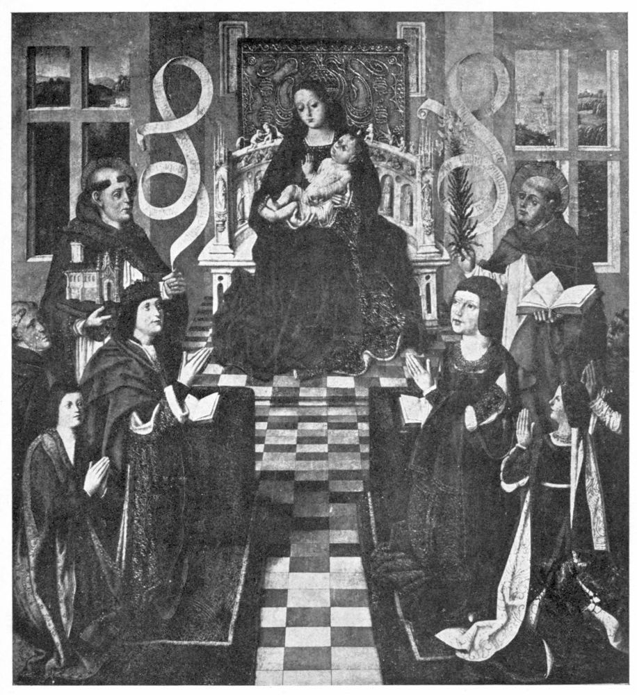 It is with the beginning of the fifteenth century that one reaches sure ground. In 1428, during the reign of Juan II of Castile, the great Flemish painter, Jan Van Eyck, while on a mission to Portugal visited Madrid. His coming aroused in the Spaniards an interest in Flemish art, which resulted in the importation of paintings by Memlinc, Roger van der Weyden, Dierick Bouts, Mabuse and Patinir. The effect of their influence can be studied in the basement galleries of the Prado, where hang anonymous works by painters of{43} the School of Castile during the fifteenth century. A very interesting series of scenes from the life of the Virgin (numbered 2178-2183) exhibits in the angular folds of the draperies and in the architecture a notable Gothic feeling, and have much of the freedom of composition and intensity of sentiment of Van der Weyden. On the other hand in No. 2184, The Catholic Kings with their Families at Prayer Before the Virgin reproduced on page 18, the influence of Memlinc and his period of Flemish art appears. One notes the charming glimpses of landscape, seen through the windows; the almost childlike sweetness of the faces and the truly Flemish love of beautiful detail. This is exhibited in the Virgin’s crimson robe and the rosy-purple gown of the King, both of which are brocaded with designs in raised gold, and in the various accessories, particularly the church in the hand of S. Thomas Aquinas, the lily in that of S. Domingo de Guzman, and the richly decorated throne. On the back of this are curious little impish figures, that recall the weirdly whimsical inventions of Hieronymus Bosch, whose pictures, as later those of his imitator, Peeter Brueghel, were very popular in northern Spain. The figure, kneeling behind the King, is the Inquisitor-General, Tomas de Torquemada; the one behind the Queen represents S. Peter Martyr of Verona.