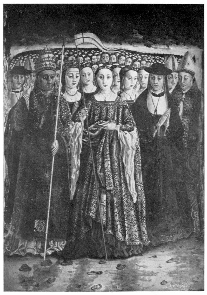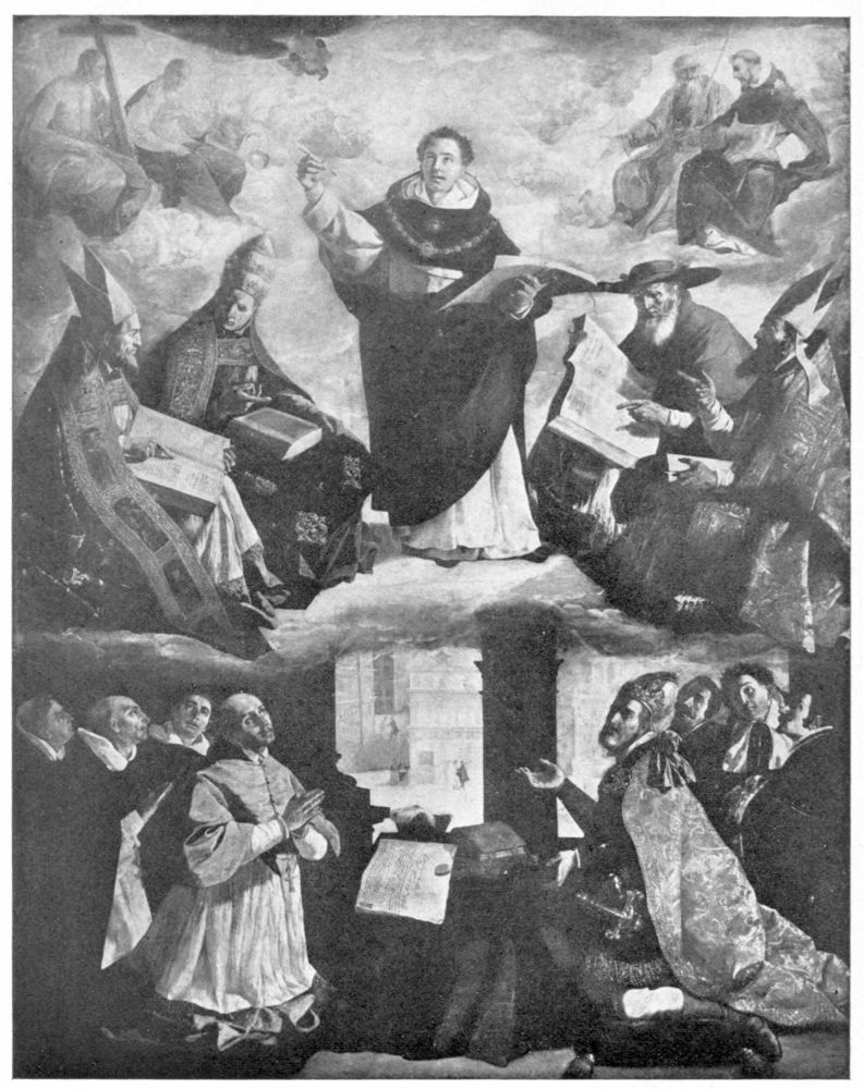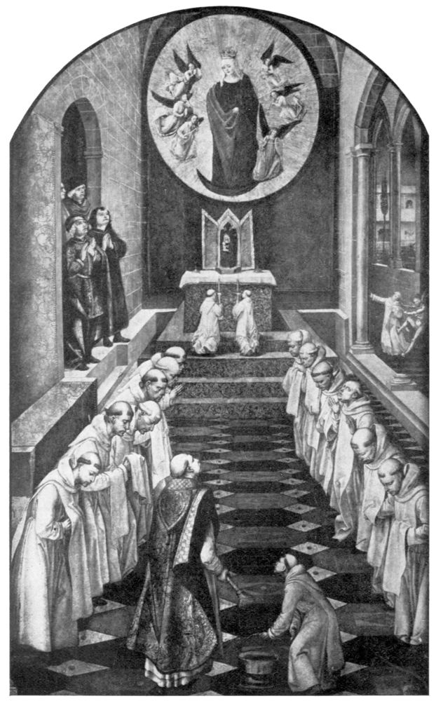 Ascribed to the end of the fifteenth century is the curiously interesting S. Ursula, reproduced on page 31. The picture forms one of a series of three, of which the first is The Coronation of the Virgin and the third The Temptation of S. Anthony. Escorted{44} by the Pope and by bishops and cardinals, S. Ursula is seen at the head of the procession of eleven thousand virgins who are following her to Rome; but, if the legend is to be believed, will be slaughtered by the Huns near Cologne. With another example, reproduced on page 37, we reach at least the suggestion of a Spanish painter’s name. The Apparition of the Virgin to a Community of Bernardine Monks During a Ceremony of Exorcism is ascribed, though with a query, to Pedro Berruguete. Carl Justi considers that this picture and its companions, illustrating Dominican legends, were by the Burgundian painter, Juan de Borgoña, assisted by Berruguete and another painter named Santos Cruz. To the last is attributed the traces of Peruginesque influence that occur in all the series; in the present example, in the angels surrounding the Madonna. But the chief interest lies in the varied and individual characterization which the artist has given to the heads of the monks and laity. The latter seem of Flemish type, and, if Carl Justi’s attribution is correct, may, together with the architectural perspective have been executed by Juan de Borgoña. On the other hand, Berruguete was probably responsible for the monks, since they approximate to the Spanish type, as may be verified by comparing them with the character studies of this order of brotherhood by Zurbarán (see page 166).