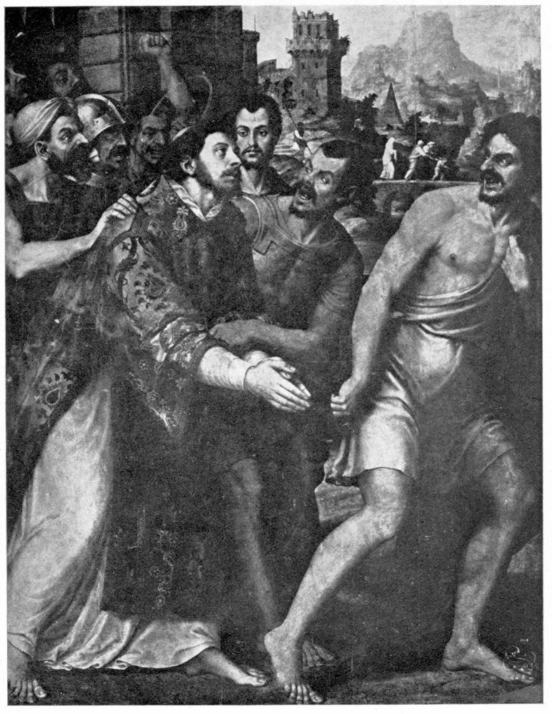An example of this is afforded by the work of Juan de Juanes, one of the early names of prominence in the School of Valencia. The S. Stephen Conducted to Martyrdom, reproduced on page 44, is an illustration of his style. It forms one of a series, connected with the life of S. Stephen, which is now in the basement galleries of the Prado. It is not difficult to detect in these paintings the influence of Raphael. So noticeable is it, that Cean Bermudez, the chronicler of early Spanish art, assumes that Juanes must have been a pupil of the Florentine master. Subsequent research, however, has discovered that the Valencian painter was not born until 1523, three years after Raphael’s death. However he may have acquired a knowledge of the latter’s style, it is evident what it did for him and, through him, for the other painters of the Valencian school and the closely affiliated school of Andalusia. Comparing this picture with the earlier ones, reproduced in these pages, one observes in it a far more varied, facile and accurate skill in drawing, and that the composition, while it has lost the charm of naturalness, has gained in science. It is organisé, as the French say, a carefully assembled structure of inter-related parts, locked together into an ensemble. On the other hand, to anticipate the sequence of our story, this artificial unity will have to be digested before its principles can be adjusted to the naturalistic presentation which is to be the peculiar quality of Spanish art. Meanwhile we can see the naturalistic tendency already forming. The fine head, immediately behind the Saint’s, is that of a Spanish gentleman of the period. All the heads, in fact, are of{47} local types, and the exaggeration of action in the figures and of emotion in the faces, is characteristic of a nation so dramatically disposed as the Spanish, while the excess of humility in the demeanour of the Saint is characteristic of the devotional attitude of this painter toward his art. For he, like many others among the Spanish artists, is said to have painted only sacred subjects and to have prepared his spirit for the task by partaking of the Sacrament.
