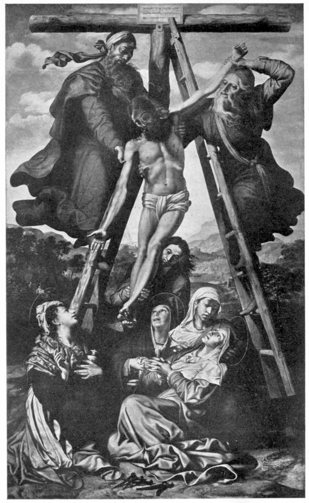 Another picture which helps to throw a light upon this period of Italian imitation is the Descent from the Cross by Pedro Campaña (page 51). This painter was born in Brussels in 1503. But, though of Flemish origin, he gained his knowledge of art in Rome, whence he passed to Spain, living in Seville for twenty-four years, until his death in 1580. Thus he was an important factor in the transitionary development of the School of Andalusia. Murillo particularly admired this picture, and at his own request was buried beneath it in the Church of Santa Cruz. When the latter was pulled down, the picture was removed to the Cathedral, where it now hangs in the Sacristy. Its indebtedness to Raphael is apparent in the group of figures at the foot of the Cross, while a Peruginesque influence is suggested in the draperies of the men upon the ladders and in the placing of their figures against the sky. But also evident is the artificiality of the whole. The gestures and expression of the women are affected; quite inadequate is the support which is being given to the Sacred Body, while the attitude of the latter is too obviously regulated with the double inten{48}tion of securing certain lines in the composition and of introducing the suggestion of forgiveness of the Magdalen. In fact, the chief virtue of the picture seems to be its extremely handsome composition, which must be admitted to have great nobility as well as a fine organic simplicity. The picture, indeed, is an achievement of science; valuable for its enforcement of academic principles; yet, even so, the work, not of a master, but a manneristic imitator.