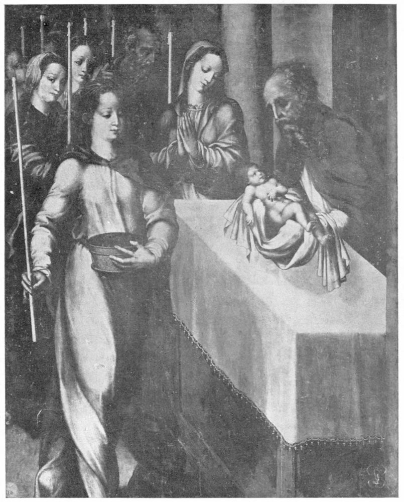 interrupted by a littleness of feeling. The latter is particularly noticeable in the highly finished rendering of the child’s body, disposed so affectedly amid the prim folds of the greyish white drapery. One may be conscious also of a certain exaggerated gesture of humility in the Virgin’s figure; but, on the other hand, how firm in its assertion of liberty of action is the supple figure of the maiden who holds the basket of doves! How excellently imagined, moreover, are the spotting of the several heads, the upright lines of the candles and the broad bold spaces of the white tablecloth!