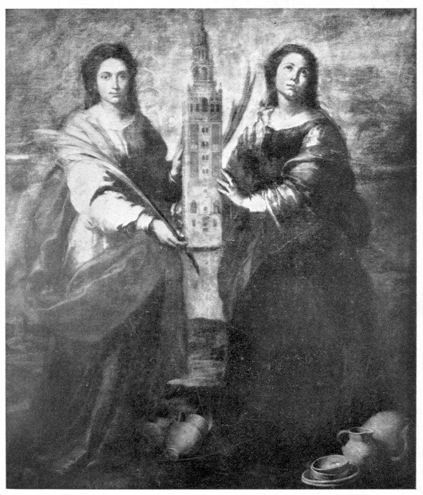 The sources of painting in Spain, as in other countries, are to be looked for, first in illuminated manuscripts and secondly in the remains of mural decorations.{42} The earliest examples of the latter are to be found in the figures of saints which adorn the little church of El Cristo de la Luz in Toledo and in some scenes from the Passion on the vaulting of the chapel of St. Catherine in San Isidoro in Léon. These are attributed to the twelfth century. Later examples of the fourteenth century, exist in Seville, in San Lorenzo, San Ildefonso and the Capella de la Antigua in the Cathedral. The subject of each is the Virgin. In the cathedral, for example, she is represented against a gold diapered background, her robe also being adorned with arabesques of gold. In her right hand she holds a rose and with her left supports the Child, while two angels suspend a crown over her head. The figure of the Father Almighty, rather small in scale, appears above. The flesh is scarcely modeled, and in the case of the Virgin is very tenderly expressed; the draperies, on the other hand, suggesting in their flatness and breadth of treatment a sense of bigness. The influence is clearly Italian and seems to present a union of the feeling of Cimabue and Fra Angelico.