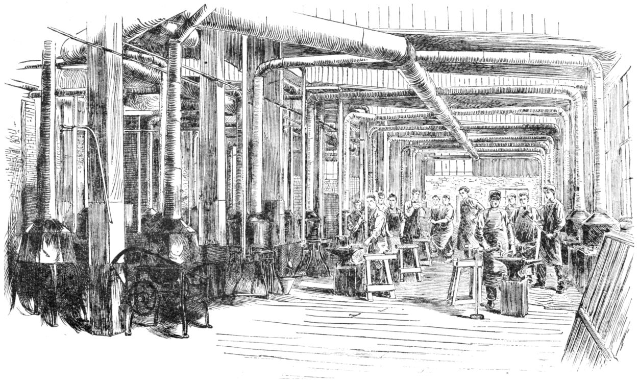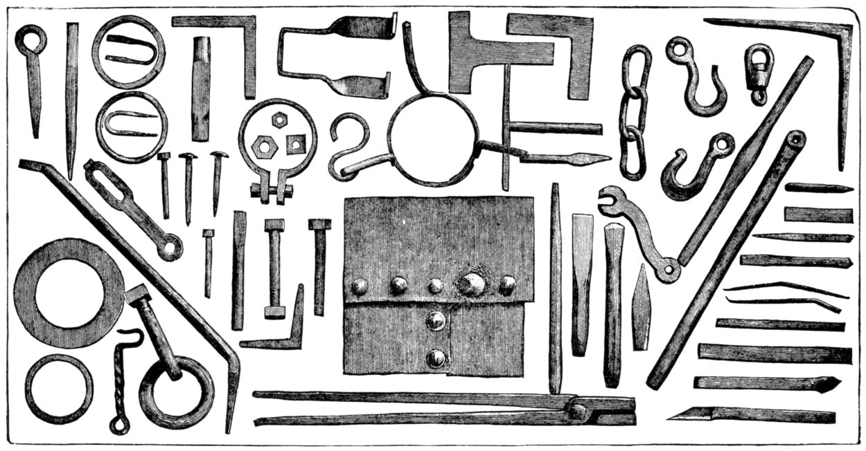 Twenty-four manly-looking Boys with Sledge-hammer in Hand — their Muscle and Brawn. — The Pride of Conscious Strength. — The Story of the Origin of an Empire. — The Greater Empire of Mechanics. — The Smelter and the Smith the Bulwark of the British Government. — Coal — its Modern Aspects; its Early History; Superstition regarding its Use. — Dud. Dudley utilizes “Pit-coal” for Smelting — the Story of his Struggles; his Imprisonment and Death. — The English People import their Pots and Kettles. — “The Blast is on and the Forge Fire sings.” — The Lesson, first on the Black-board, then in Red-hot Iron on the Anvil. — Striking out the Anvil Chorus — the Sparks fly whizzing through the Air. — The Mythological History of Iron. — The Smith in Feudal Times. — His Versatility. — History of Damascus Steel. — We should reverence the early Inventors. — The Useful Arts finer than the Fine Arts. — The Ancient Smelter and Smith, and the Students in the Manual-training School.58
