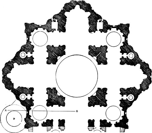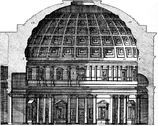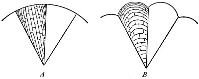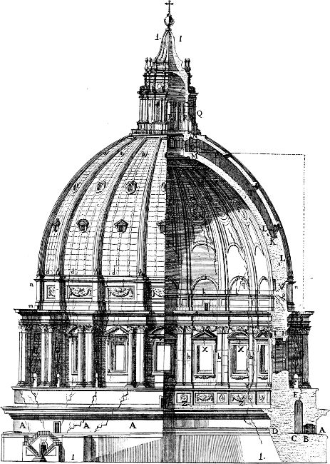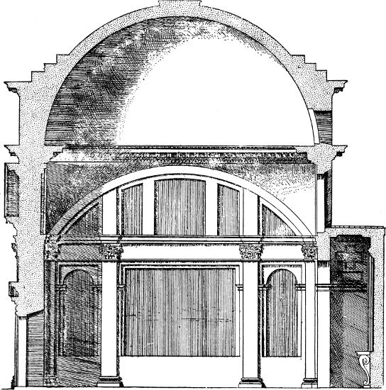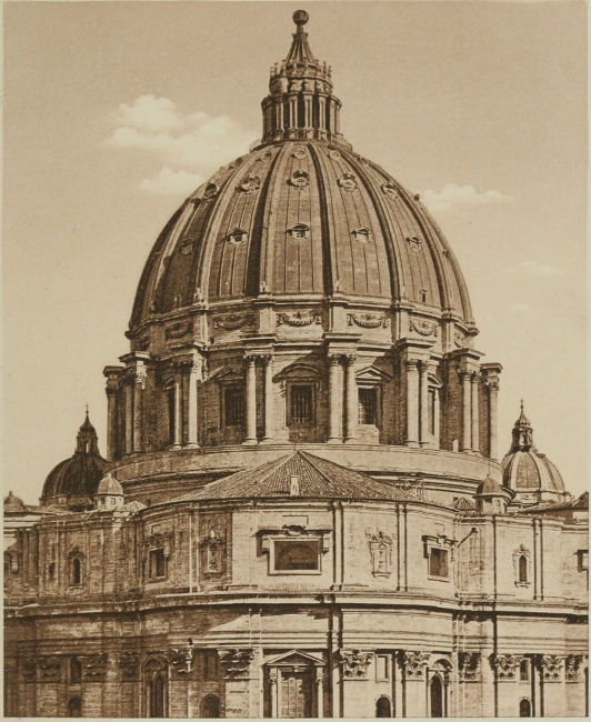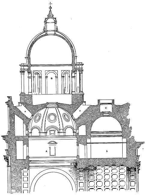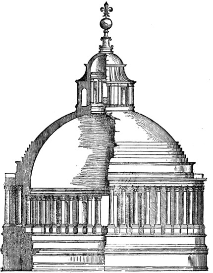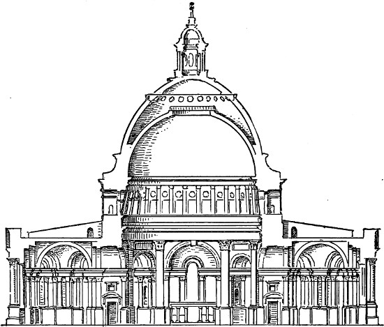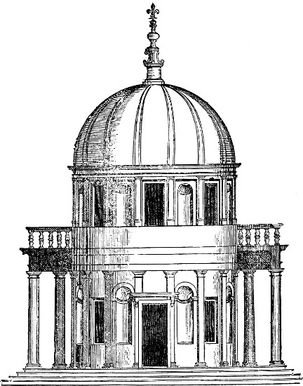 | Bramante in Rome—His early training—Character of the Tempietto of San Pietro in Montorio—Its likeness to a Roman temple of Vesta—Bramante’s project for St. Peter’s—Uncertainty as to his scheme for the whole building—His design for the great dome—Sources of his inspiration—Comparison of his dome with that of the Pantheon—Structural merits and defects—The architect’s probable intention to use a great order for the interior of the church—Michael Angelo’s appointment as architect—His scheme for the great dome—Its statical defects—Its supposed Gothic character—Comparison with the dome of Salamanca—Its illogical buttress system—Its ruptures and the alarm which they occasioned—Commission appointed to examine the fabric and report on its condition—Poleni’s opinion and his binding chains—The grandiose character of the dome—In following Brunelleschi, Michael Angelo went farther in a wrong direction—Such a scheme cannot be safely carried out without resort to extraneous means of support—The proper mode of constructing a dome settled by the ancient Roman and the Byzantine builders—Condition of the dome ignored by recent writers—The ruptures attributed by the early Italian writers to carelessness on the part of Bramante—The beauty of the dome exaggerated—Its violation of structural propriety incompatible with the highest architectural beauty | 44 |