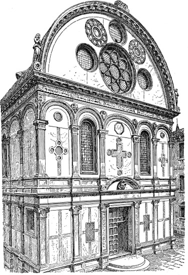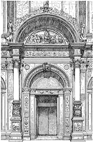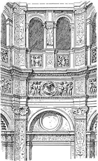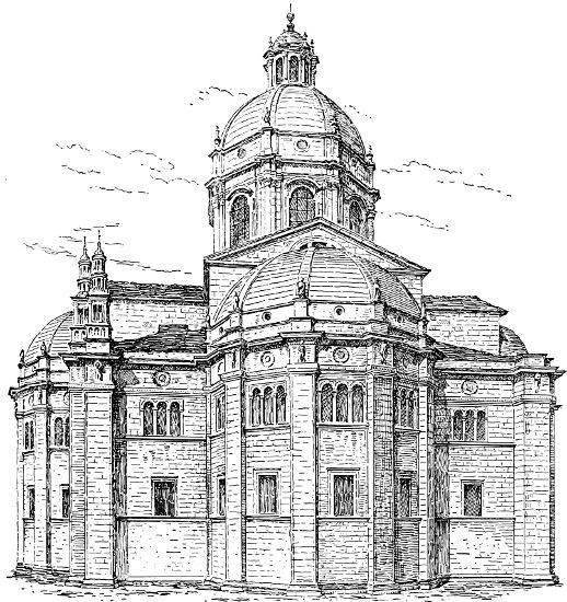 | Various other phases of the architecture of the Renaissance—The façade of San Bernardino of Perugia—The façade of the Certosa of Pavia—Its combination of local mediæval and distorted neo-classic features—The church and sacristy of San Satiro—Evidence that both were designed by Bramante—Santa Maria delle Grazie—Its dome—Architectural treatment of its exterior—Its attribution to Bramante—The chapel of St. Peter Martyr attributed to Michelozzi—The Monastero Maggiore—The cathedral of Como—Evidence of Bramante’s hand in the east end—Its details of mediæval Lombard character mixed with neo-classic elements—The south portal—The windows of the nave—Architecture of the Venetian Renaissance—The church of San Zaccaria—Peculiar column of its interior—The church of San Salvatore—Its piers—Attic of the interior—The church of Santa Maria dei Miracoli—Architectural treatment of its exterior—Excellence of its mechanical execution—The façade of Santa Maria Formosa | 135 |
