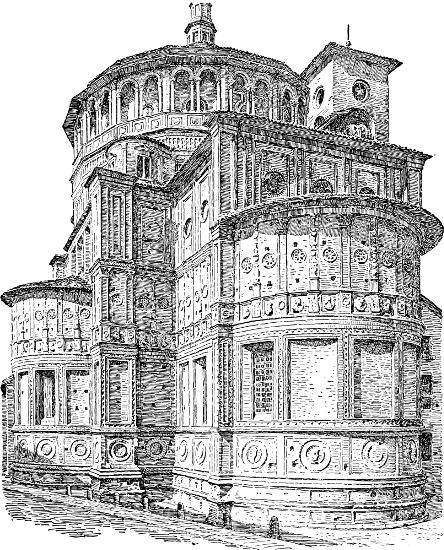 [104] Cf. Casati, _I Capi d’Arte di Bramante da Urbino nel Milanese_, Milan, 1870, p. 24 _et seq._ That the design of San Satiro was made by Bramante, Casati gives the evidence of a document printed in the year 1500 by the deputies of the church in which it is said, “ ... _Come vi si diede principio dopo l’anno 1470 con disegno del celebre Bramante_.” And he finds further confirmation of Bramante’s authorship in a commentary on Vitruvius by Cesare Cesariano, printed in Como in 1521, where this author states that the church and sacristy of San Satiro were designed by his preceptor, Donato of Urbino, called Bramante.