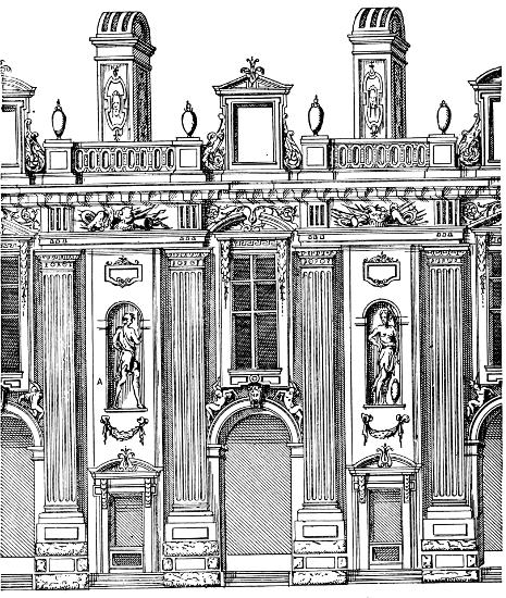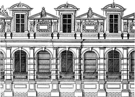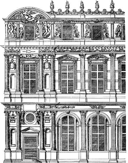 [139] Viollet le Duc, I may say again, appears to me greatly to overestimate De l’Orme’s artistic powers when he says, “Dans les œuvres de Philibert De l’Orme on constate une étude attentive et soigneuse des proportions, des rapports harmonieux qui semblent les plus simples, mais qui cependent sont le résultat d’une connaissance parfaite de son art et des moyens mis à sa disposition,” and when he speaks of the Tuileries as follows: “C’était bien là une architecture de palais grande et noble par ses masses, précieuse par ses détails.” _Entretiens sur l’Architecture_, vol. 1, p. 363.