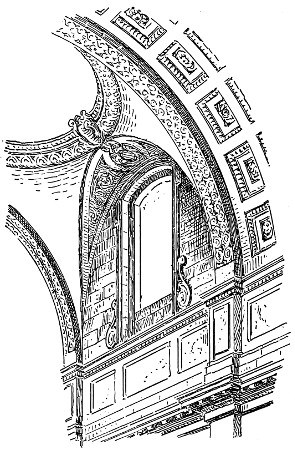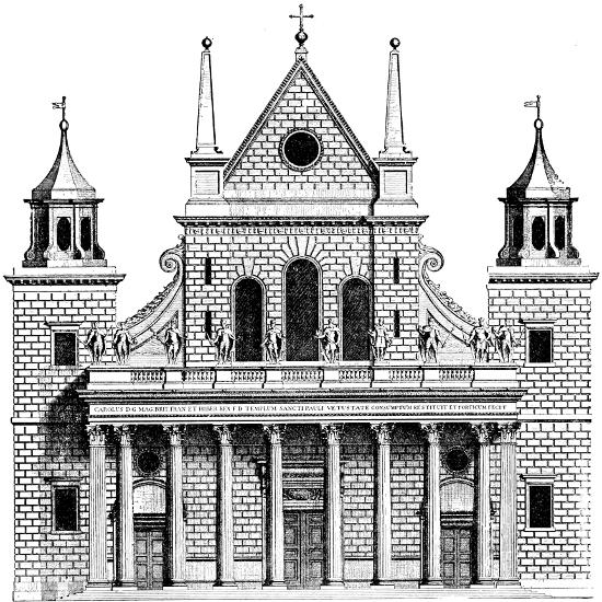 | The architecture of England in the seventeenth century properly called Renaissance only by extension of the term—Jones and Wren the only architects of importance at this time—Walpole’s extravagant estimate of Inigo Jones—The early career of Jones—His design for the Banqueting Hall of the palace of Whitehall—Its lack of English character—Analysis of the design—Kent’s exaggerated estimate of Jones’s genius—The scheme for the whole palace—Jones’s design for the façade of old St. Paul’s—Thoughtless laudation of the art of Inigo Jones—Sir Christopher Wren—Artistic notions of the English dilettanti in the seventeenth century—Wren’s architectural training—His visit to France—The Sheldonian Theatre—Wren’s project for repairs of old St. Paul’s—His commission to rebuild—His first scheme for the new edifice—Sources of inspiration for the great dome—Rejection of the first scheme—The so-called warrant design—The existing edifice—The structural system of the dome—Character of the interior of the church—The masking of the buttress system—Wren’s city churches | 226 |