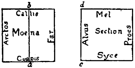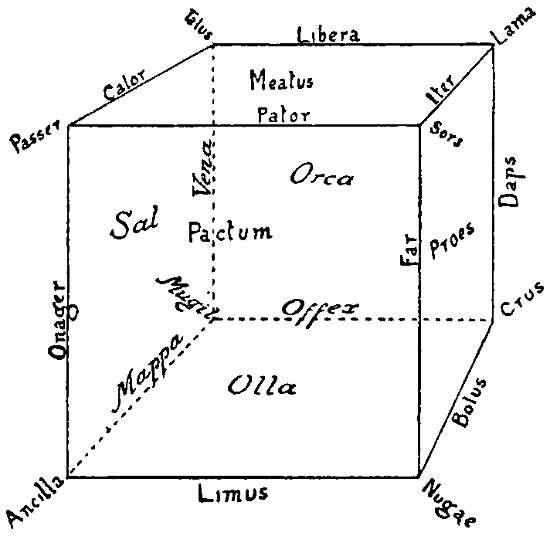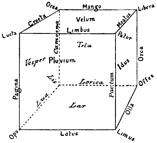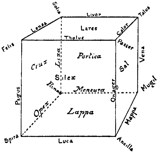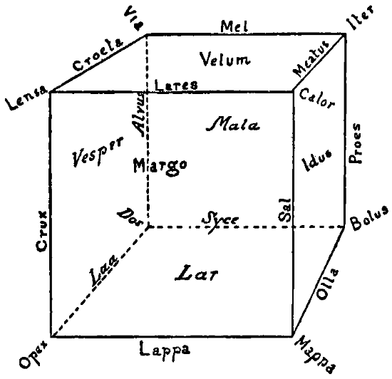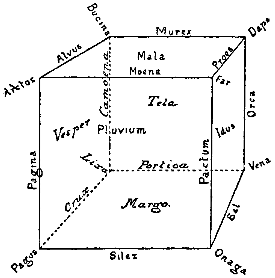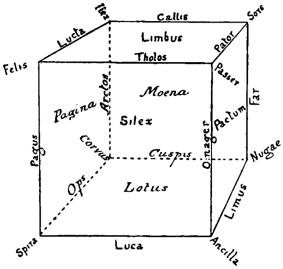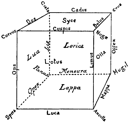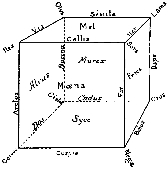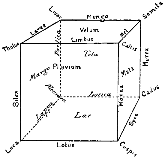 Points: Corvus, Gold. Nugæ, Fawn. Crus, Terra-cotta. Cista, Buff. Ilex, Light-blue. Sors, Dull-purple. Lama, Deep-blue. Olus, Red.