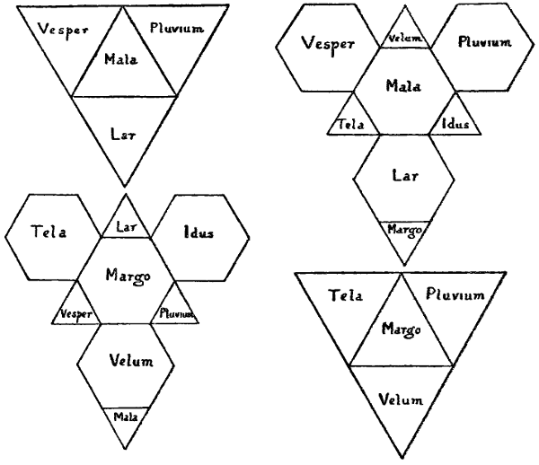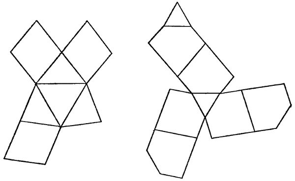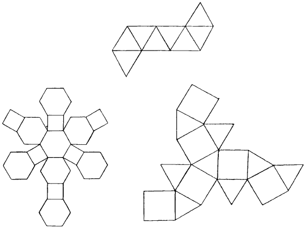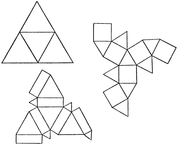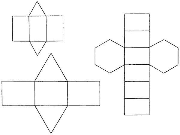 A few figures are given, which, if cut out and folded along the lines, will show some of the sections of a tessaract. But the reader is earnestly begged not to be content with looking at the shapes only. That will teach him nothing about a tessaract, or four-dimensional space, and will only tend to produce in his mind a feeling that “the fourth dimension” is an unknown and unthinkable region, in which any shapes may be right, as given sections of its figures, and of which any statement may be true. While, in fact, if it is the case that the laws of spaces of two and three dimensions may, with truth, be carried on into space of four dimensions; then the little our solidity (like the flatness of a plane-being) will allow us to learn of these shapes and relations, is no more a matter of doubt to us than what we learn of two- and three-dimensional shapes and relations.