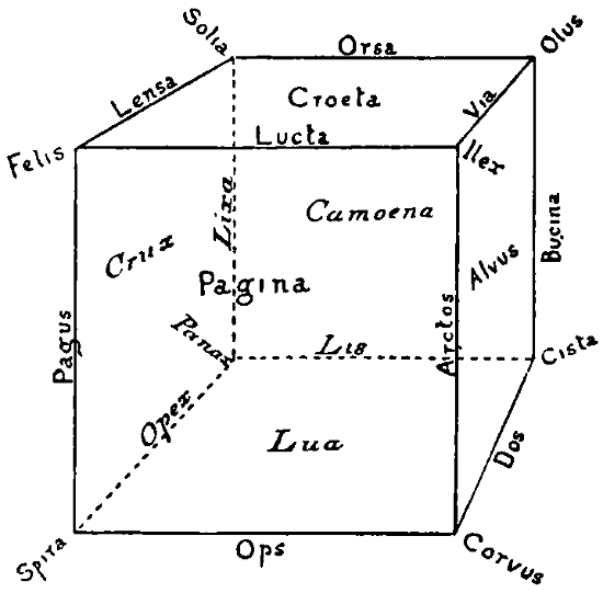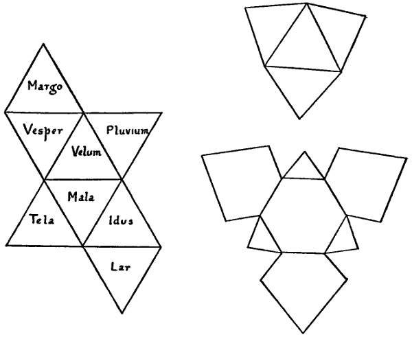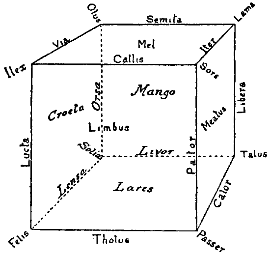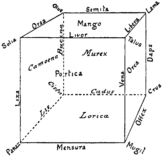 A tetrahedron may be regarded as a cube with every alternate corner cut off. Thus, if Mala have the corner towards Corvus cut off as far as the points Ilex, Nugæ, Cista, and the corner towards Sors cut off as far as Ilex, Nugæ, Lama, and the corner towards Crus cut off as far as Lama, Nugæ, Cista, and the corner towards Olus cut off as far as Ilex, Lama, Cista, what is left of the cube is a tetrahedron, whose angles are at the points Ilex, Nugæ, Cista, Lama. In a similar manner, if every alternate corner of a tessaract be cut off, the figure that is left is a tetra-tessaract, which is a figure bounded by sixteen regular tetrahedrons.