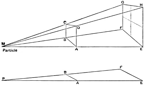 Suppose that instead of a sheet and a thread, there were a straight line and a plane. If the straight line were placed slantingwise in reference to the plane and moved downwards, it would always cut the plane in a point, but that point of section would move on. If the plane were of such a nature as to close up behind the line, if it were of the nature of a fluid, what would be observed would be a moving point. If now there were a whole system of lines sloping in different directions, but all connected together, and held absolutely still by one framework, and if this framework with its system of lines were as a whole to pass slowly through the fluid plane at right angles to it, there would then be the appearance of a multitude of moving points in the plane, equal in number to the number of straight lines in the system. The lines in the framework will all be moving at the same rate—namely, at the rate of the framework in which they are fixed. But the points in the plane will have different velocities. They will move slower or faster, according as the lines which give rise to them are more or less inclined to the plane. A straight line perpendicular to the plane will, on passing through, give rise to a stationary point. A straight line that slopes very much inclined to the plane will give rise 20 to a point moving with great swiftness. The motions and paths of the points would be determined by the arrangement of the lines in the system. It is obvious that if two straight lines were placed lying across one another like the letter X, and if this figure were to be stood upright and passed through the plane, what would appear would be at first two points. These two points would approach one another. When the part where the two strokes of the X meet came into the plane, the two points would become one. As the upper part of the figure passed through, the two points would recede from one another.