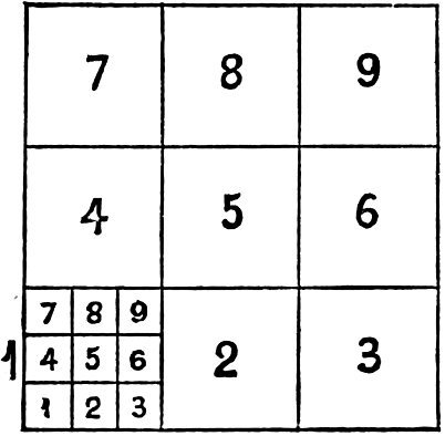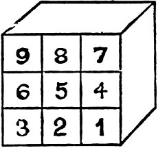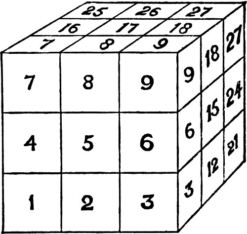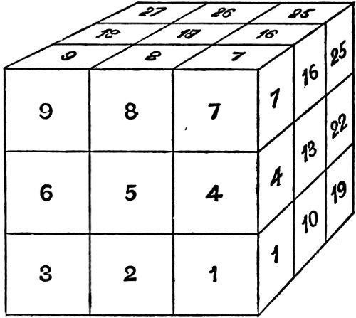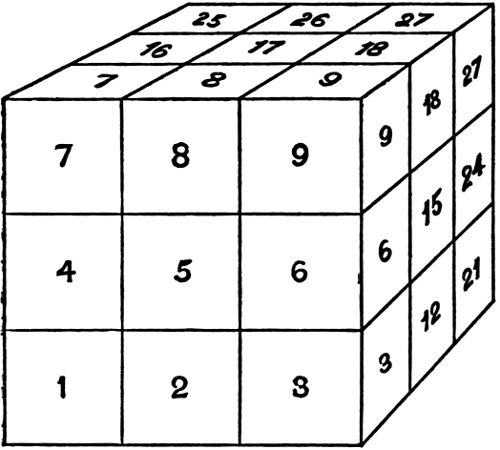 Let Diagram I. represent a small block of cubes. It is itself in the form of a cube, and it contains 27 cubes. For purposes of reference we will give a number to each cube, and the number will denote the cube where it is.
